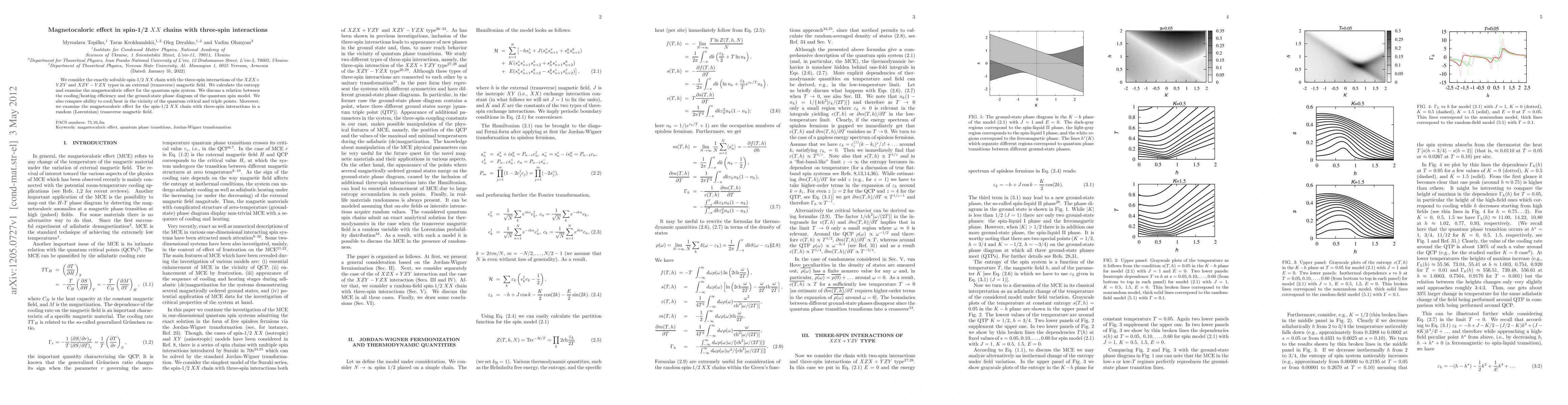 We consider the exactly solvable spin-1/2 $XX$ chain with the three-spin interactions of the $XZX+YZY$ and $XZY-YZX$ types in an external (transverse) magnetic field. We calculate the entropy and examine the magnetocaloric effect for the quantum spin system. We discuss a relation between the cooling/heating efficiency and the ground-state phase diagram of the quantum spin model. We also compare ability to cool/heat in the vicinity of the quantum critical and triple points. Moreover, we examine the magnetocaloric effect for the spin-1/2 $XX$ chain with three-spin interactions in a random (Lorentzian) transverse magnetic field.