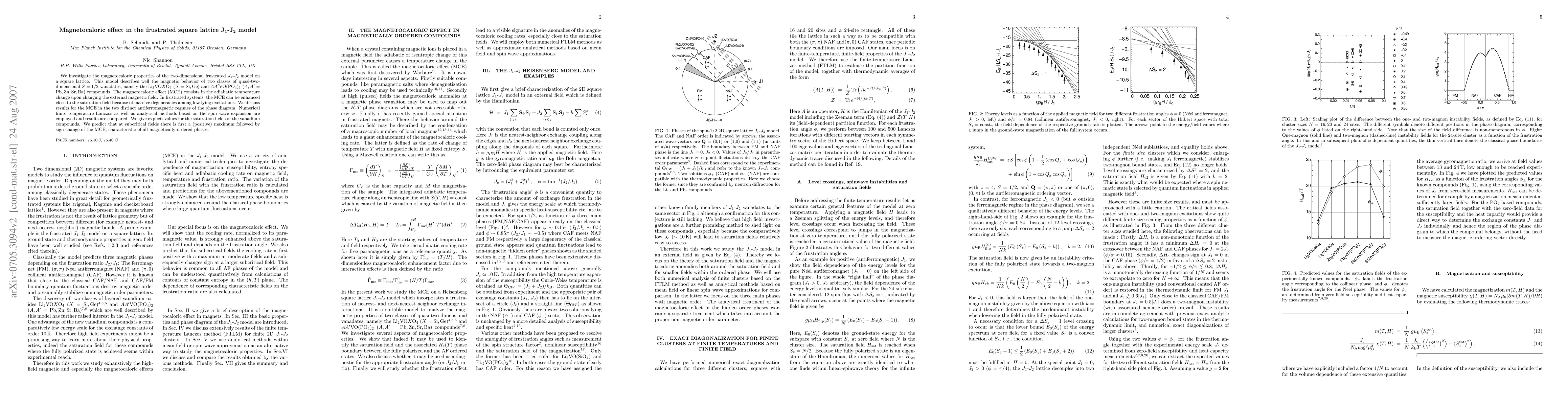 This paper investigates the magnetocaloric effect in the frustrated J1-J2 model on a square lattice, focusing on its magnetic behavior in quasi-two-dimensional S = 1/2 vanadate compounds. The study predicts an enhanced magnetocaloric effect near saturation fields due to degeneracies among low-lying excitations, with numerical and analytical methods revealing a characteristic sign change in the effect at subcritical fields.