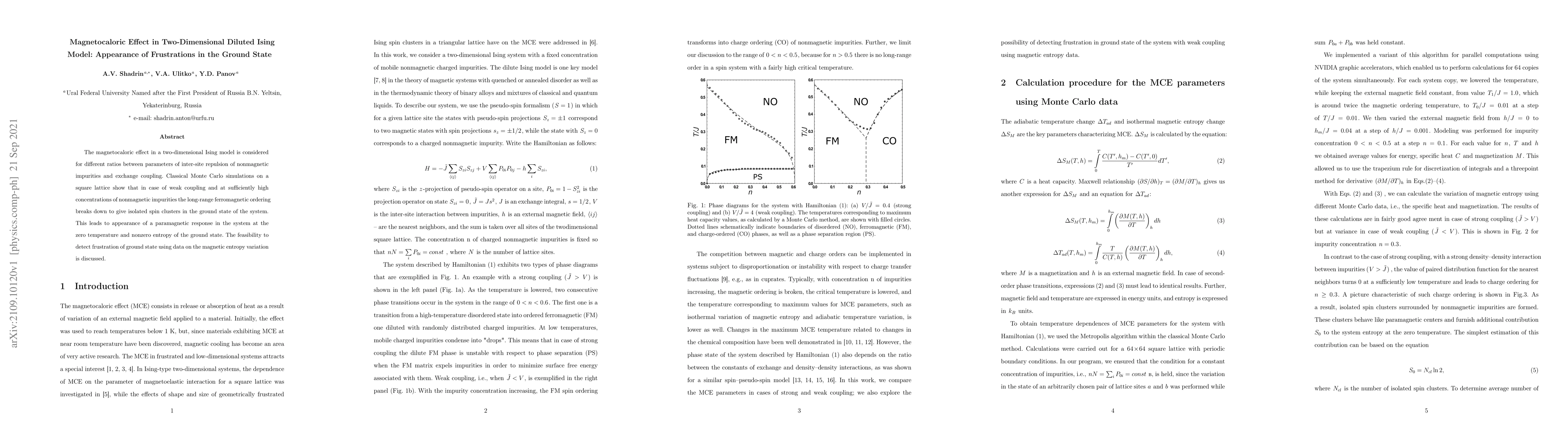 The magnetocaloric effect in a two-dimensional Ising model is considered for different ratios between parameters of inter-site repulsion of nonmagnetic impurities and exchange coupling. Classical Monte Carlo simulations on a square lattice show that in case of weak coupling and at sufficiently high concentrations of nonmagnetic impurities the long-range ferromagnetic ordering breaks down to give isolated spin clusters in the ground state of the system. This leads to appearance of a paramagnetic response in the system at the zero temperature and nonzero entropy of the ground state. The feasibility to detect frustration of ground state using data on the magnetic entropy variation is discussed