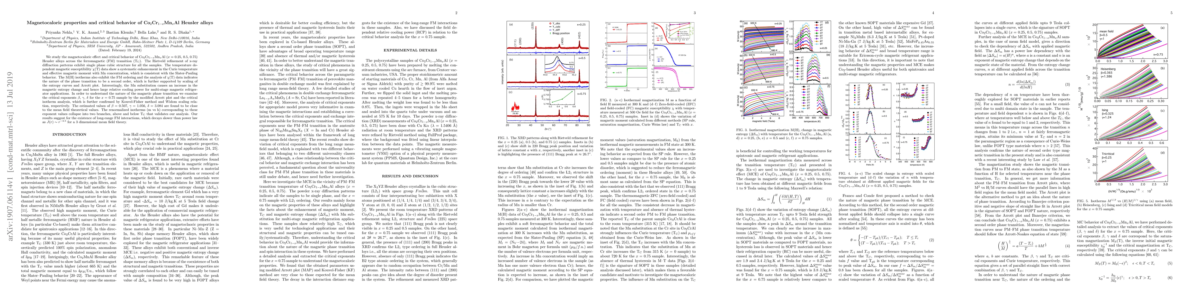 We study the magnetocaloric effect and critical behavior of Co$_2$Cr$_{1-x}$Mn$_x$Al ($x=$ 0.25, 0.5, 0.75) Heusler alloys across the ferromagnetic (FM) transition (T$_{\rm C}$). The Rietveld refinement of x-ray diffraction patterns exhibit single phase cubic structure for all the samples. The temperature dependent magnetic susceptibility $\chi$(T) data show a systematic enhancement in the Curie temperature and effective magnetic moment with Mn concentration, which is consistent with the Slater-Pauling behavior. The M(H) isotherms also exhibit the FM ordering and the analysis of $\chi$(T) data indicates the nature of the phase transition to be a second order, which is further supported by scaling of the entropy curves and Arrott plot. Interestingly, the Mn substitution causes an increase in the magnetic entropy change and hence large relative cooling power for multi-stage magnetic refrigerator applications. In order to understand the nature of the magnetic phase transition we examine the critical exponents $\beta$, $\gamma$, $\delta$ for the $x=$ 0.75 sample by the modified Arrott plot and the critical isotherm analysis, which is further confirmed by Kouvel-Fisher method and Widom scaling relation, respectively. The estimated values of $\beta=$ 0.507, $\gamma=$ 1.056, $\delta=$ 3.084 are found to be close to the mean field theoretical values. The renormalized isotherms (m vs h) corresponding to these exponent values collapse into two branches, above and below T$_{\rm C}$ that validates our analysis. Our results suggest for the existence of long-range FM interactions, which decays slower than power law as $J(r)\sim r^{-4.5}$ for a 3 dimensional mean field theory.