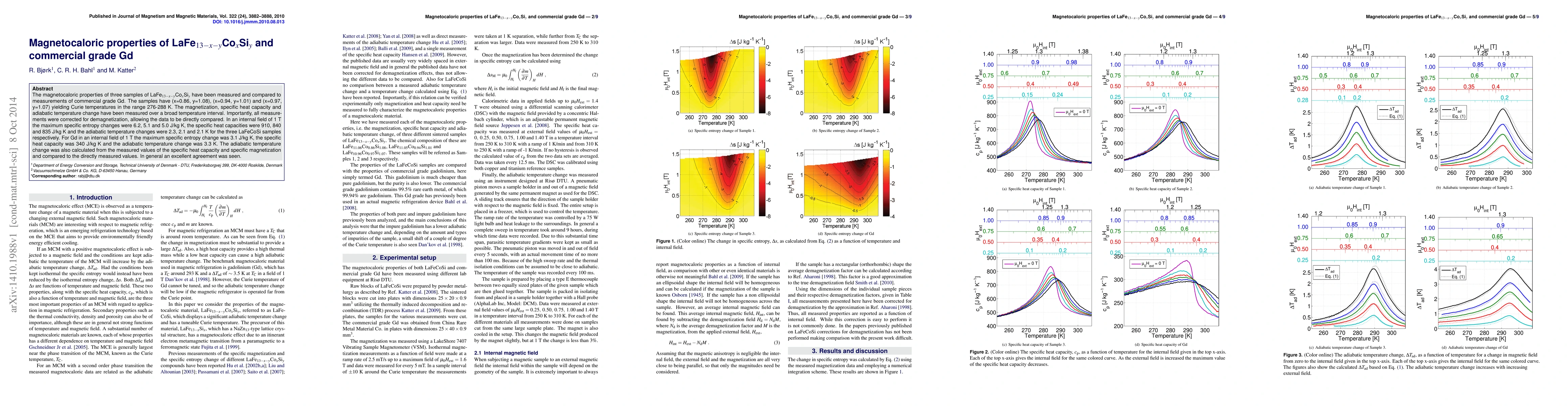 This study compares magnetocaloric properties of LaFeCoSi alloys with varying Co and Si content to those of commercial Gd. Measurements of magnetization, specific heat capacity, and adiabatic temperature change were conducted on LaFeCoSi samples with Curie temperatures between 276-288K. Demagnetization corrections allowed direct comparison. Maximum specific entropy changes for LaFeCoSi ranged from 6.2 to 5.0 J/kg K, while Gd showed 3.1 J/kg K. Specific heat capacities for LaFeCoSi varied from 910 to 835 J/kg K, and Gd was 340 J/kg K. Adiabatic temperature changes for LaFeCoSi were 2.3 to 2.1 K, and Gd was 3.3 K. Direct and calculated adiabatic temperature changes showed excellent agreement.