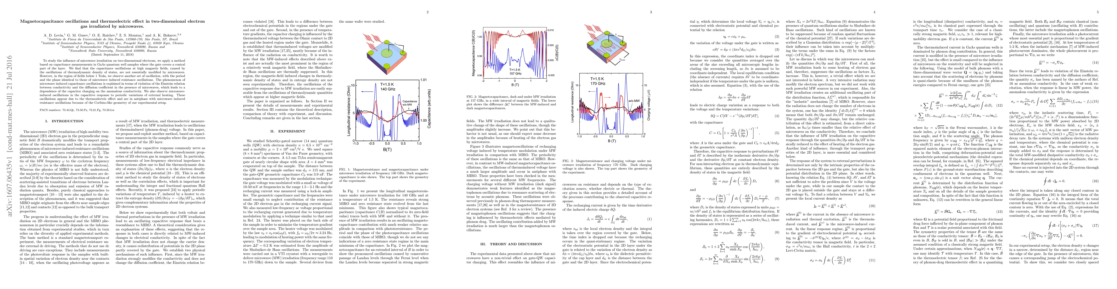 Researchers found that microwaves do not significantly alter capacitance oscillations in 2D electrons at high magnetic fields but induce oscillations below 1 Tesla due to a violation of the Einstein relation. The phenomenon also leads to thermoelectric effects.