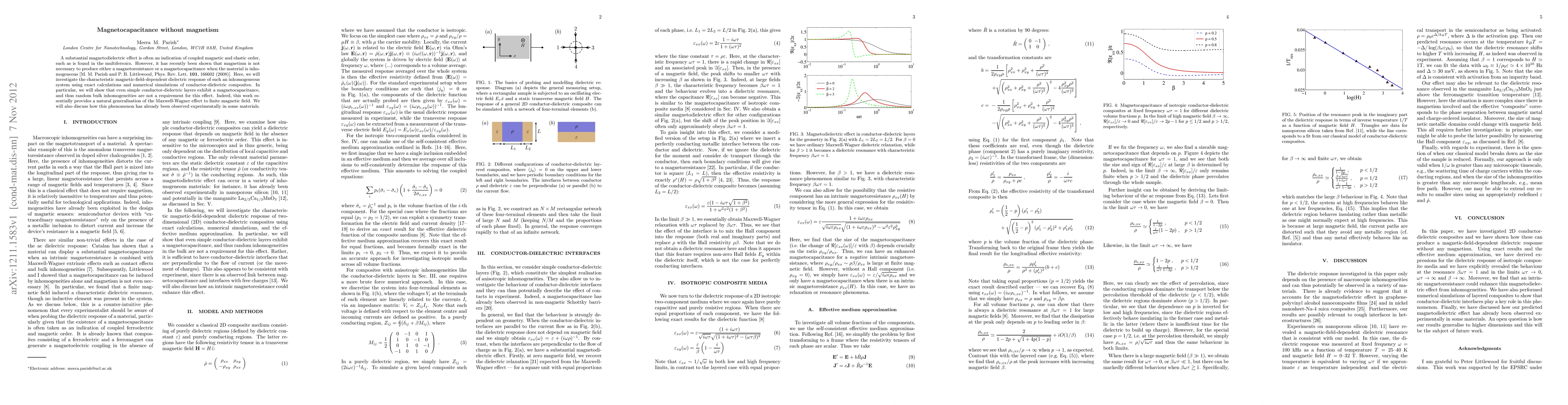 This research demonstrates that magnetocapacitance, a phenomenon usually linked to magnetism, can occur without it in inhomogeneous conductor-dielectric composites. The study uses exact calculations and simulations to show even simple layered structures exhibit this effect, generalizing the Maxwell-Wagner phenomenon to finite magnetic fields. Experimental observations of this effect in certain materials are also discussed.