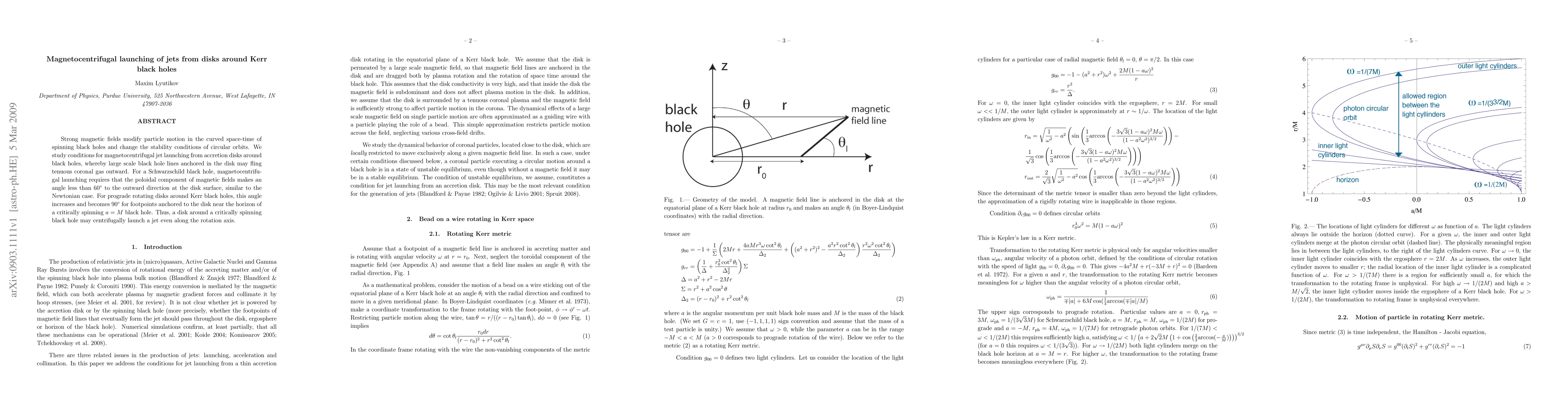 This paper investigates the magnetocentrifugal launching of jets from accretion disks around Kerr black holes, showing that strong magnetic fields can alter particle motion and stability conditions. The study finds that for a critically spinning black hole, jets can be launched even along the rotation axis due to increased angles of the poloidal magnetic field component.