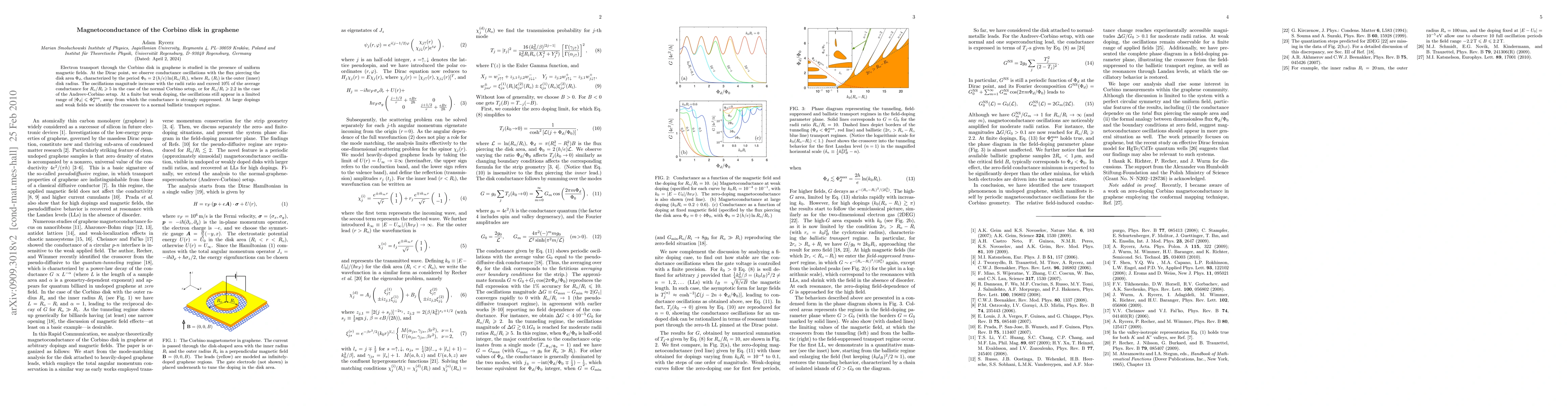 The paper presents a detailed theoretical analysis of electron transport in graphene Corbino disks under magnetic fields, deriving expressions for transmission probabilities and conductance oscillations.