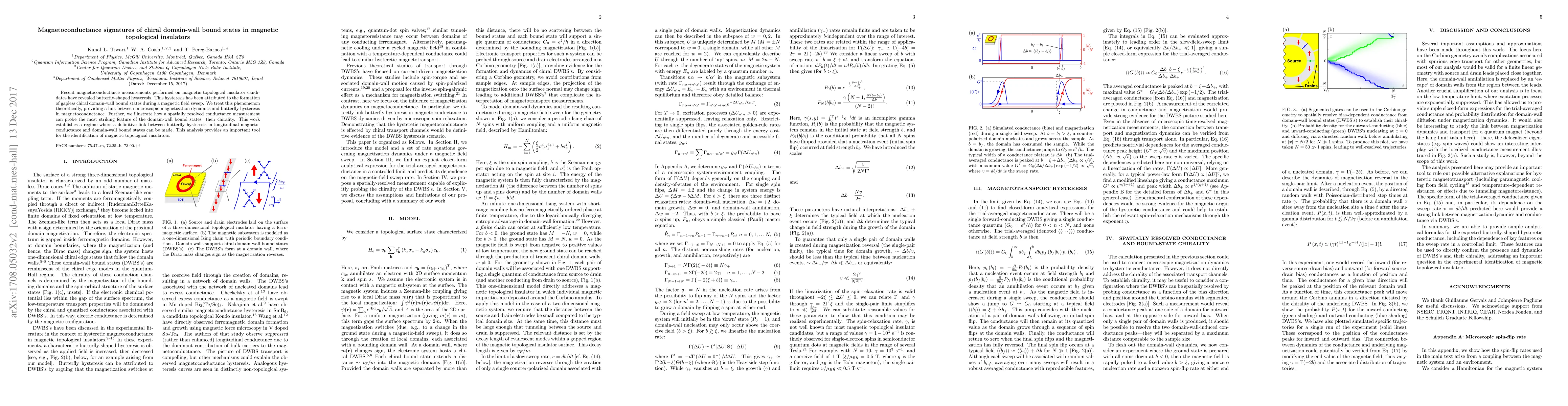 Recent magnetoconductance measurements performed on magnetic topological insulator candidates have revealed butterfly-shaped hysteresis. This hysteresis has been attributed to the formation of gapless chiral domain-wall bound states during a magnetic field sweep. We treat this phenomenon theoretically, providing a link between microscopic magnetization dynamics and butterfly hysteresis in magnetoconductance. Further, we illustrate how a spatially resolved conductance measurement can probe the most striking feature of the domain-wall bound states: their chirality. This work establishes a regime where a definitive link between butterfly hysteresis in longitudinal magneto-conductance and domain-wall bound states can be made. This analysis provides an important tool for the identification of magnetic topological insulators.