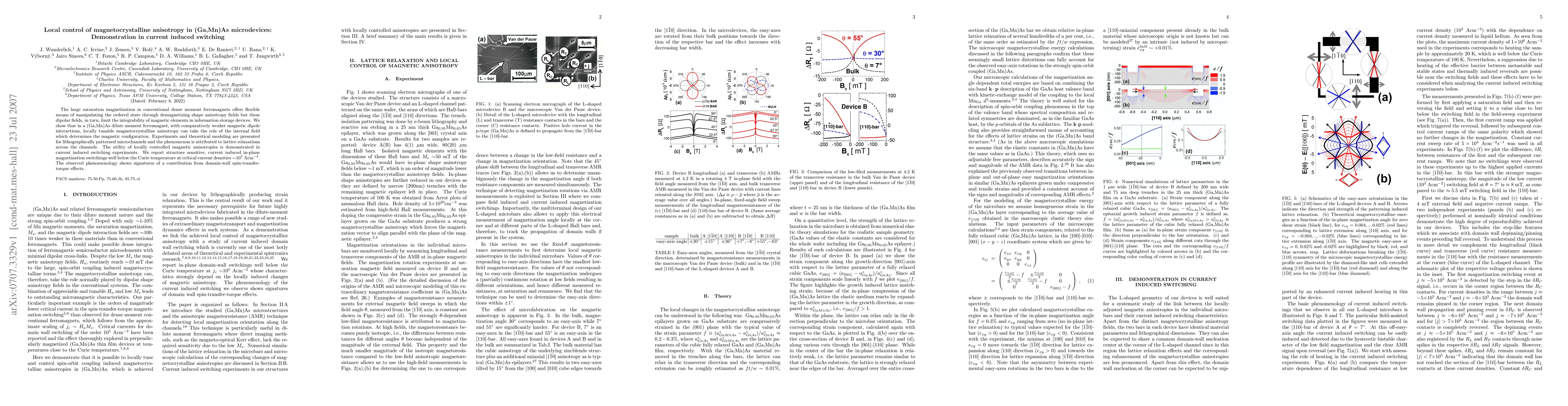 This paper demonstrates that magnetocrystalline anisotropy in (Ga,Mn)As can control local magnetic configurations in spin-transfer-torque microdevices, overcoming limitations posed by magnetic dipole interactions. Experiments show current-induced magnetization switching facilitated by lattice relaxations, indicating potential for improved magnetic element integration in storage devices.