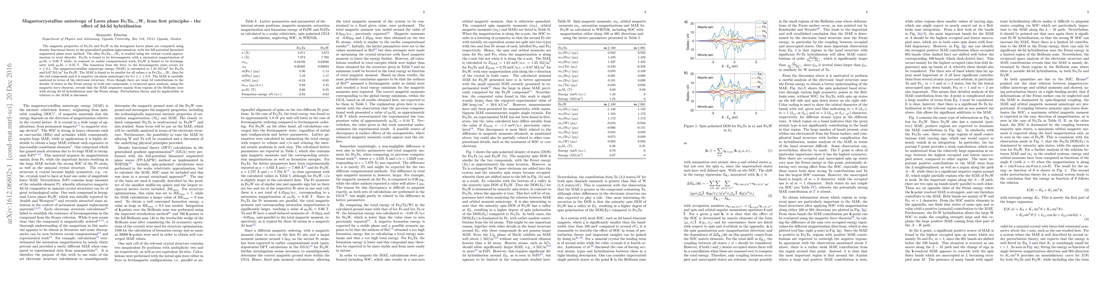 The magnetic properties of Fe$_2$Ta and Fe$_2$W in the hexagonal Laves phase are computed using density functional theory in the generalised gradient approximation, with the full potential linearised augmented plane wave method. The alloy Fe$_2$Ta$_{1-x}$W$_x$ is studied using the virtual crystal approximation to treat disorder. Fe$_2$Ta is found to be ferromagnetic with a saturation magnetization of $\mu_0 M_\text{s} = 0.66~\mathrm{T}$ while, in contrast to earlier computational work, Fe$_2$W is found to be ferrimagnetic with $\mu_0 M_\text{s} = 0.35~\mathrm{T}$. The transition from the ferri- to the ferromagnetic state occurs for $x \leq 0.1$. The magnetocrystalline anisotropy energy (MAE) is calculated to $1.25~\mathrm{MJ/m^3}$ for Fe$_2$Ta and $0.87~\mathrm{MJ/m^3}$ for Fe$_2$W. The MAE is found to be smaller for all values $x$ in Fe$_2$Ta$_{1-x}$W$_x$ than for the end compounds and it is negative (in-plane anisotropy) for $0.1 \leq x \leq 0.9$. The MAE is carefully analysed in terms of the electronic structure. Even though there are weak 5d contributions to the density of states at the Fermi energy in both end compounds, a reciprocal space analysis, using the magnetic force theorem, reveals that the MAE originates mainly from regions of the Brillouin zone with strong 3d-5d hybridisation near the Fermi energy. Perturbation theory and its applicability in relation to the MAE is discussed.