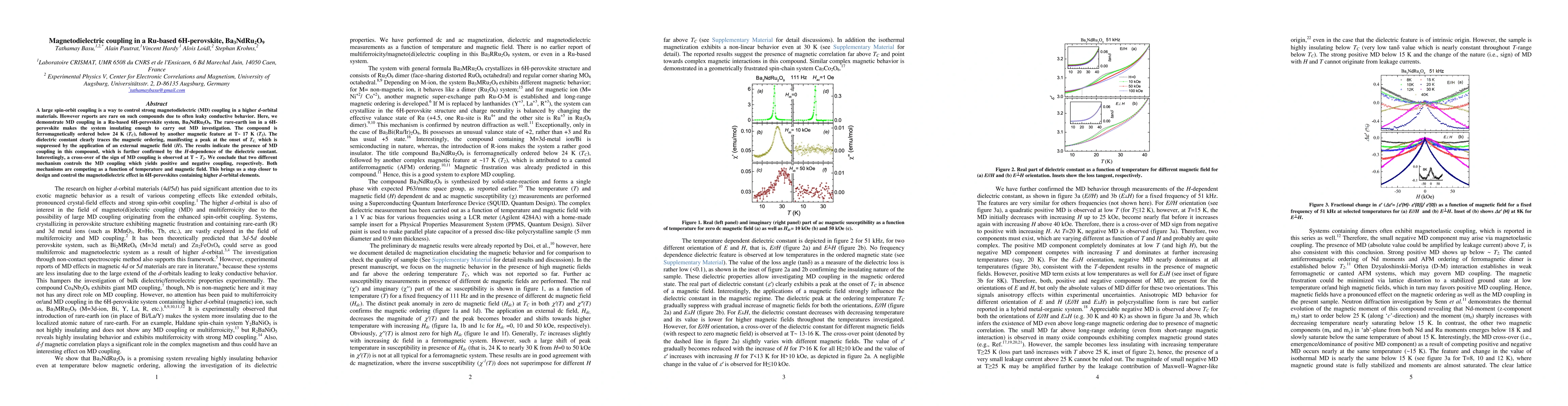 A large spin-orbit coupling is a way to control strong magnetodielectric (MD) coupling in a higher d-orbital materials. However reports are rare on such compounds due to often leaky conductive behavior. Here, we demonstrate MD coupling in a Ru-based 6H-perovskite system, Ba3NdRu2O9. The rare-earth ion in a 6H-perovskite makes the system insulating enough to carry out MD investigation. The compound is ferromagnetically ordered below 24 K (TC), followed by another magnetic feature at T~ 17 K (T2). The dielectric constant clearly traces the magnetic ordering, manifesting a peak at the onset of TC, which is suppressed by the application of an external magnetic field (H). The results indicate the presence of MD coupling in this compound, which is further confirmed by the H-dependence of the dielectric constant. Interestingly, a cross-over of the sign of MD coupling is observed at T ~ T2. We conclude that two different mechanism controls the MD coupling which yields positive and negative coupling, respectively. Both mechanisms are competing as a function of temperature and magnetic field. This brings us a step closer to design and control the magnetodielectric effect in 6H-perovskites containing higher d-orbital elements.