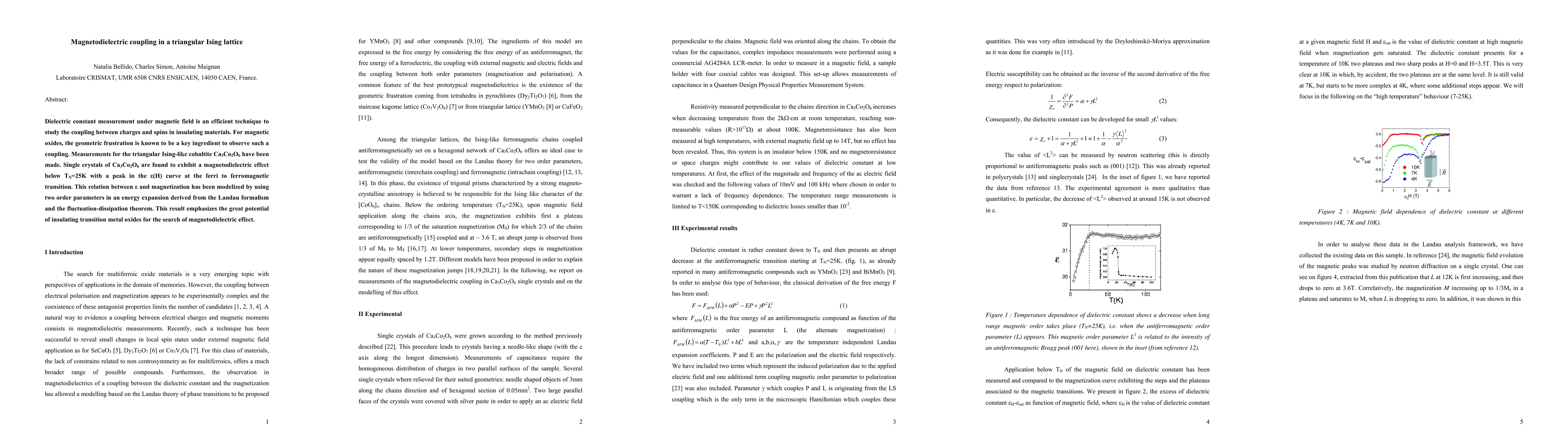 Dielectric constant measurement under magnetic field is an efficient technique to study the coupling between charges and spins in insulating materials. For magnetic oxides, the geometric frustration is known to be a key ingredient to observe such a coupling. Measurements for the triangular Ising-like cobaltite Ca3Co2O6 have been made. Single crystals of Ca3Co2O6 are found to exhibit a magnetodielectric effect below TN=25K with a peak in the e(H) curve at the ferri to ferromagnetic transition. This relation between e and magnetization has been modelized by using two order parameters in an energy expansion derived from the Landau formalism and the fluctuation-dissipation theorem. This result emphasizes the great potential of insulating transition metal oxides for the search of magnetodielectric effect.