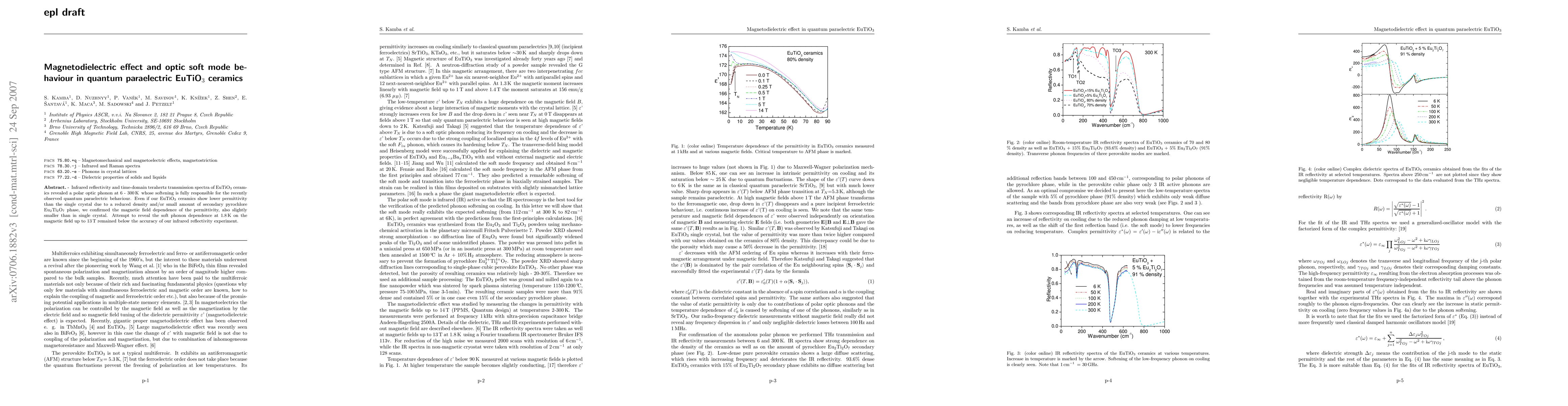This paper investigates the magnetodielectric effect in EuTiO3 ceramics, revealing a polar optic phonon responsible for quantum paraelectric behaviour. Despite lower permittivity due to reduced density and secondary phase, the study confirms magnetic field dependence of permittivity, though the effect on soft phonons at low temperatures remains undetectable.