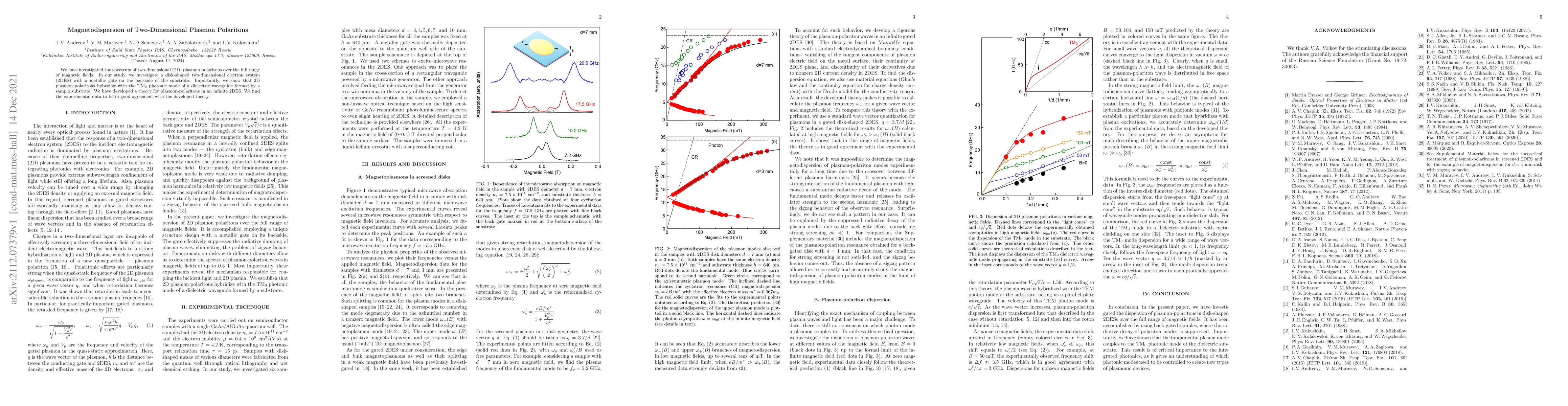 This research explores the magnetodispersion of two-dimensional plasmon polaritons in a disk-shaped electron system, demonstrating their hybridization with the TM$_0$ mode of a dielectric waveguide. The study supports a newly developed theoretical model, showing strong agreement between experimental data and the theoretical predictions.