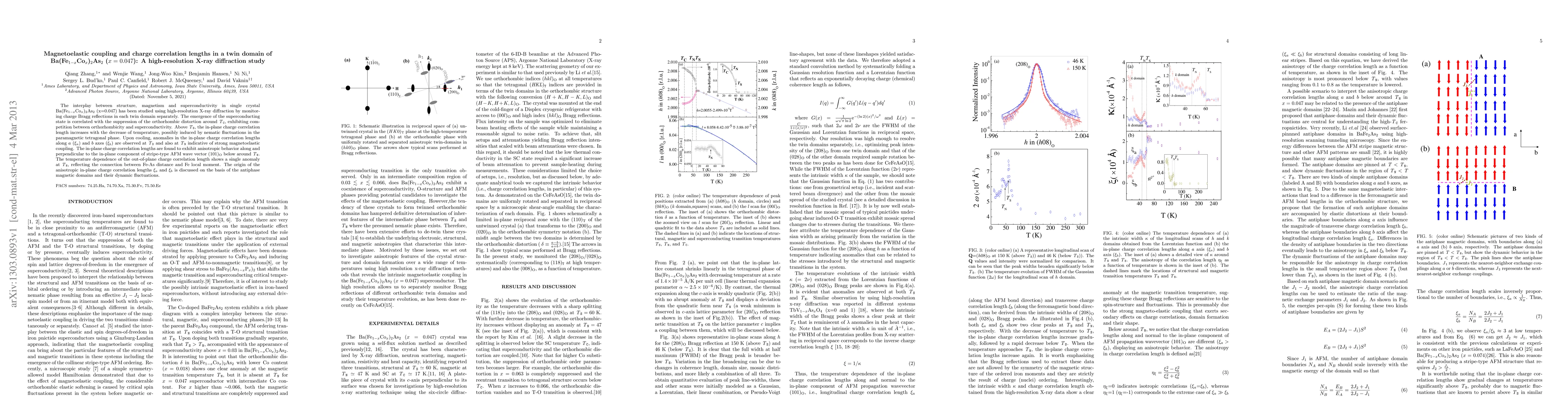 The interplay between structure, magnetism and superconductivity in single crystal Ba(Fe$_{1-x}$Co$_{x}$)$_{2}$As$_{2}$ (x=0.047) has been studied using high-resolution X-ray diffraction by monitoring charge Bragg reflections in each twin domain separately. The emergence of the superconducting state is correlated with the suppression of the orthorhombic distortion around \emph{T}$_\texttt{C}$, exhibiting competition between orthorhombicity and superconductivity. Above \emph{T}$_\texttt{S}$, the in-plane charge correlation length increases with the decrease of temperature, possibly induced by nematic fluctuations in the paramagnetic tetragonal phase. Upon cooling, anomalies in the in-plane charge correlation lengths along $a$ ($\xi_{a}$) and $b$ axes ($\xi_{b}$) are observed at \emph{T}$_\texttt{S}$ and also at \emph{T}$_\texttt{N}$ indicative of strong magnetoelastic coupling. The in-plane charge correlation lengths are found to exhibit anisotropic behavior along and perpendicular to the in-plane component of stripe-type AFM wave vector (101)$_{\rm O}$ below around \emph{T}$_\texttt{N}$. The temperature dependence of the out-of-plane charge correlation length shows a single anomaly at \emph{T}$_\texttt{N}$, reflecting the connection between Fe-As distance and Fe local moment. The origin of the anisotropic in-plane charge correlation lengths $\xi_{a}$ and $\xi_{b}$ is discussed on the basis of the antiphase magnetic domains and their dynamic fluctuations.
