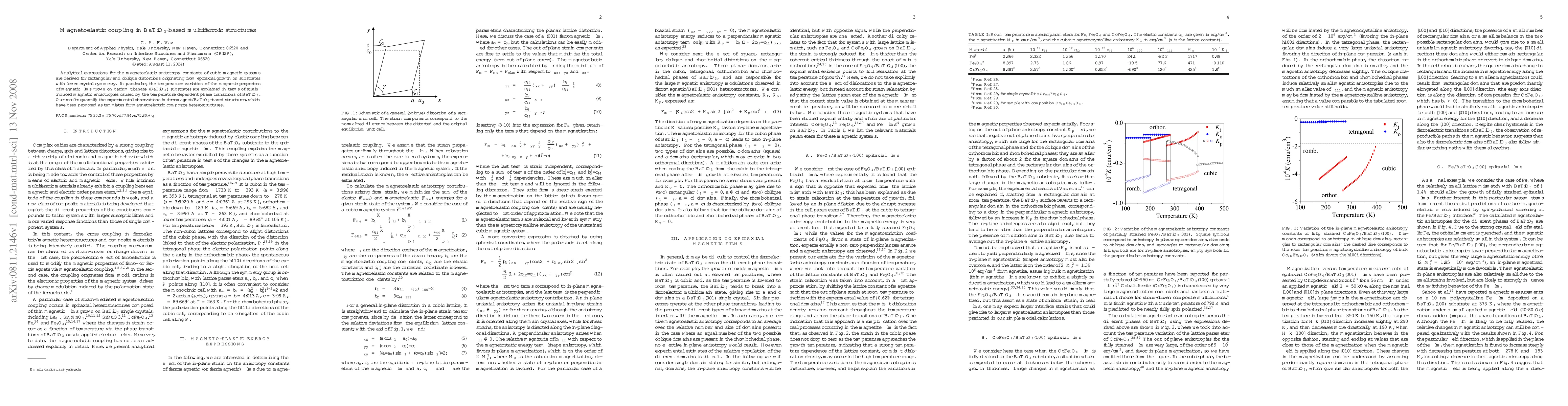 Summary: This paper derives analytical expressions for magnetoelastic anisotropy constants in cubic magnetic systems subjected to distortions from epitaxial growth on barium titanate substrates, explaining temperature-induced magnetic property variations due to strain from phase transitions in BaTiO3, and quantifies observations in multiferroic heterostructures.
