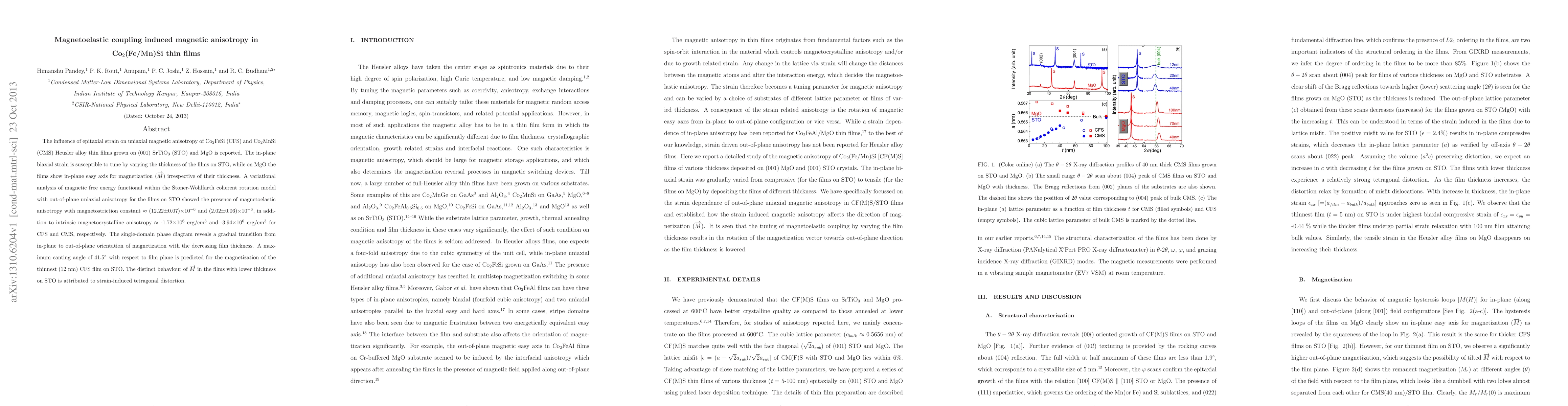 The influence of epitaxial strain on uniaxial magnetic anisotropy of Co$_{2}$FeSi (CFS) and Co$_{2}$MnSi (CMS) Heusler alloy thin films grown on (001) SrTiO$_3$ (STO) and MgO is reported. The in-plane biaxial strain is susceptible to tune by varying the thickness of the films on STO, while on MgO the films show in-plane easy axis for magnetization (\overrightarrow{M}) irrespective of their thickness. A variational analysis of magnetic free energy functional within the Stoner-Wohlfarth coherent rotation model with out-of-plane uniaxial anisotropy for the films on STO showed the presence of magnetoelastic anisotropy with magnetostriction constant $\approx$ (12.22$\pm$0.07)$\times 10^{-6}$ and (2.02$\pm$0.06)$\times 10^{-6}$, in addition to intrinsic magnetocrystalline anisotropy $\approx$ -1.72$\times 10^{6}$ erg/cm$^{3}$ and -3.94$\times 10^{6}$ erg/cm$^{3}$ for CFS and CMS, respectively. The single-domain phase diagram reveals a gradual transition from in-plane to out-of-plane orientation of magnetization with the decreasing film thickness. A maximum canting angle of 41.5$^{\circ}$ with respect to film plane is predicted for the magnetization of the thinnest (12 nm) CFS film on STO. The distinct behaviour of \overrightarrow{M} in the films with lower thickness on STO is attributed to strain-induced tetragonal distortion.