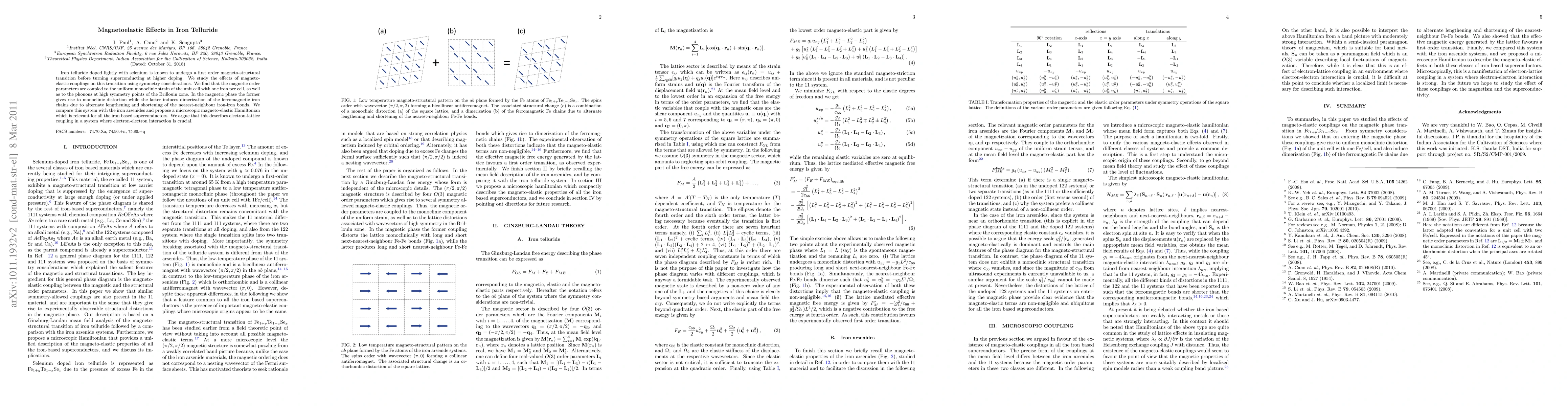 Iron telluride doped lightly with selenium is known to undergo a first order magneto-structural transition before turning superconducting at higher doping. We study the effects of magneto-elastic couplings on this transition using symmetry considerations. We find that the magnetic order parameters are coupled to the uniform monoclinic strain of the unit cell with one iron per cell, as well as to the phonons at high symmetry points of the Brillouin zone. In the magnetic phase the former gives rise to monoclinic distortion while the latter induces dimerization of the ferromagnetic iron chains due to alternate lengthening and shortening of the nearest-neighbour iron-iron bonds. We compare this system with the iron arsenides and propose a microscopic magneto-elastic Hamiltonian which is relevant for all the iron based superconductors. We argue that this describes electron-lattice coupling in a system where electron-electron interaction is crucial.
