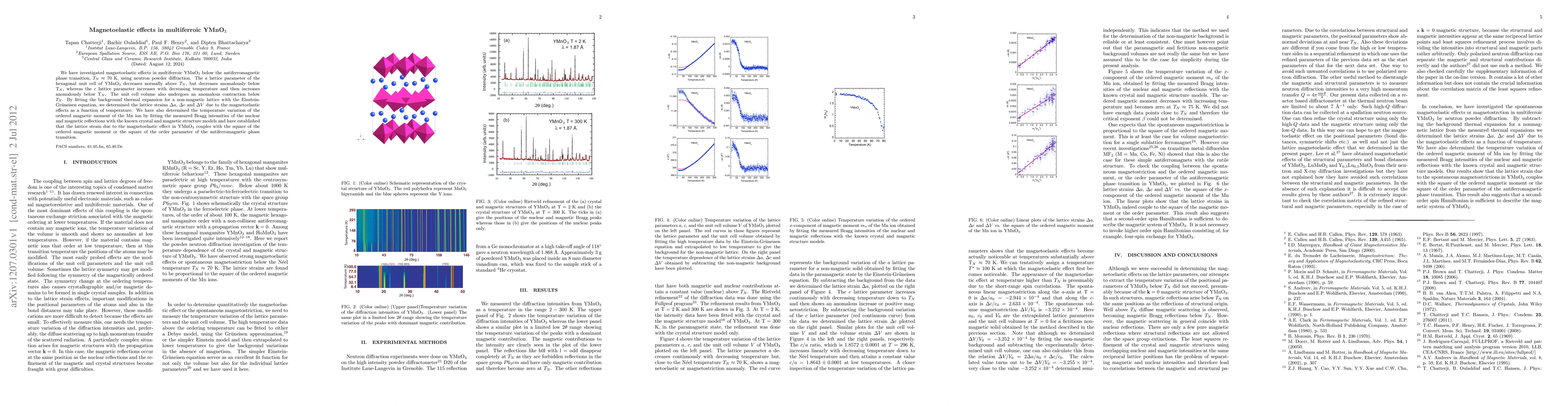 This study investigates magnetoelastic effects in YMnO$_3$ below its antiferromagnetic transition at $T_N \approx 70$ K, revealing anomalous lattice parameter changes and unit cell volume contraction. The research shows that magnetoelastic strain is coupled to the square of the ordered magnetic moment, indicating a strong interplay between magnetic and structural phases.
