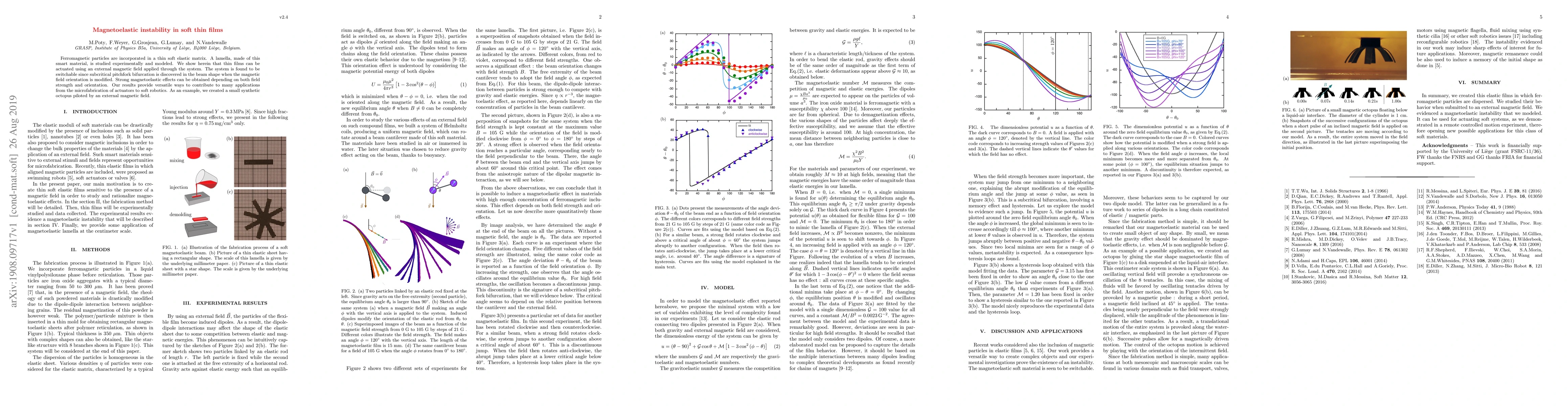 Ferromagnetic particles are incorporated in a thin soft elastic matrix. A lamella, made of this smart material, is studied experimentally and modeled. We show herein that thin films can be actuated using an external magnetic field applied through the system. The system is found to be switchable since subcritical pitchfork bifurcation is discovered in the beam shape when the magnetic field orientation is modified. Strong magnetoelastic effects can be obtained depending on both field strength and orientation. Our results provide versatile ways to contribute to many applications from the microfabrication of actuators to soft robotics. As an example, we created a small synthetic octopus piloted by an external magnetic field.