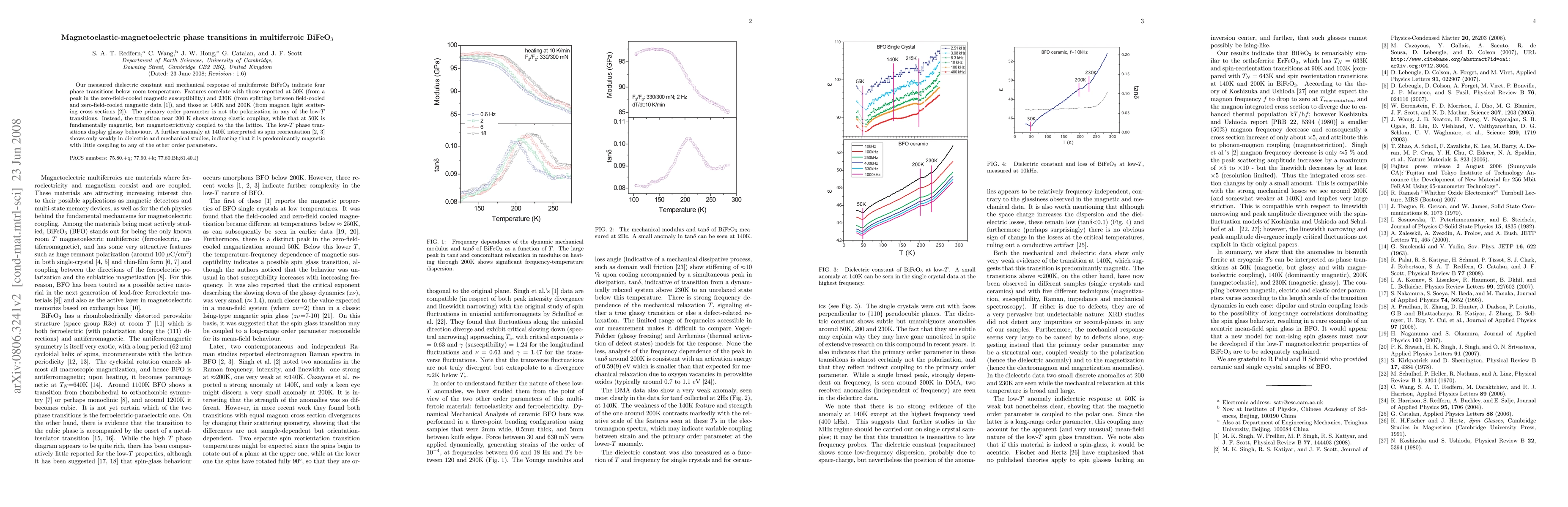 Our measured dielectric constant and mechanical response of multiferroic BiFeO3 indicate four phase transitions below room temperature. Features correlate with those reported at 50K (from a peak in the zero-field-cooled magnetic susceptibility) and 230K (from splitting between field-cooled and zero-field-cooled magnetic data[1], and 200K (from magnon light scattering cross sections[2]). The primary order parameter is not the polarization in any of the low-T transitions. Instead, the transition near 230 K shows strong elastic coupling, while that at 50K is fundamentally magnetic, but magnetostrictively coupled to the the lattice. The low-T phase transitions display glassy behaviour. A further anomaly at 140K interpreted as spin reorientation[2,3] shows only weakly in dielectric and mechanical studies, indicating that it is predominantly magnetic with little coupling to any of the other order parameters.