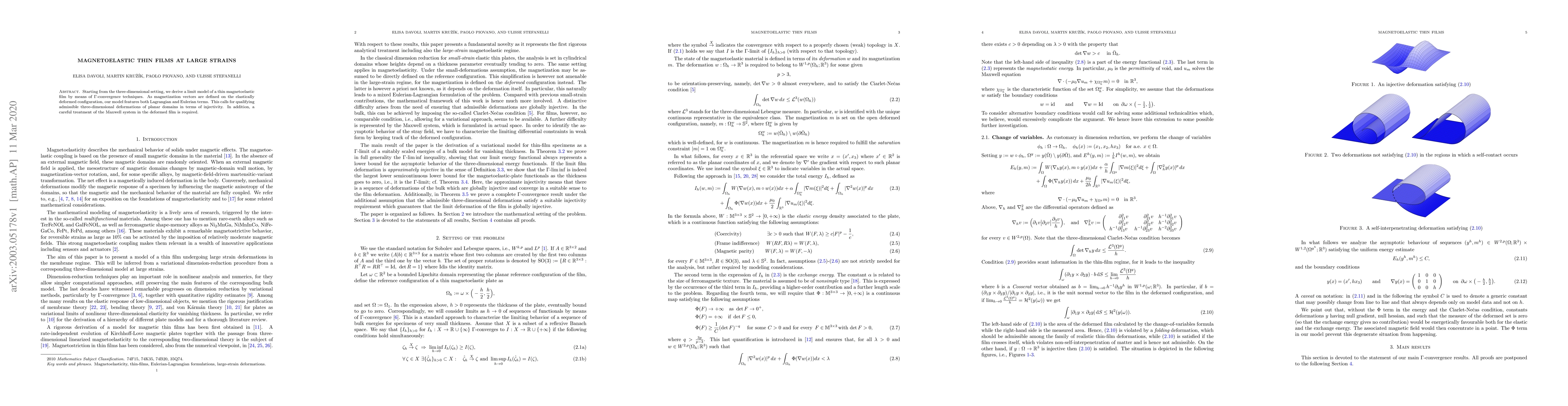 Researchers developed a limit model for thin magnetoelastic films under large strains using η-convergence techniques. The model accounts for both Lagrangian and Eulerian terms and provides insights into admissible deformations.