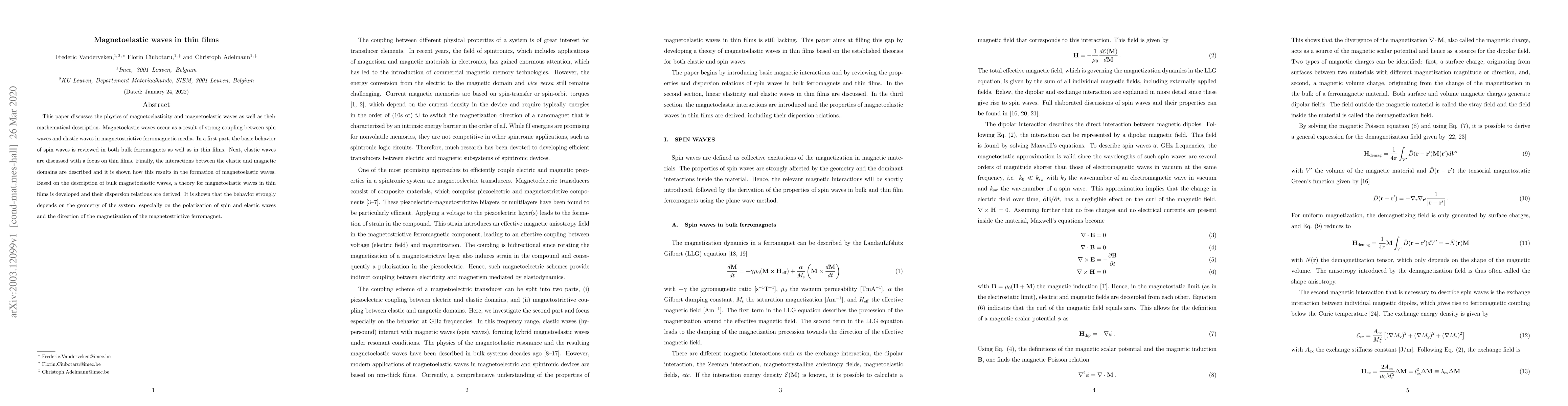 This paper reviews the physics and mathematical modeling of magnetoelastic waves, focusing on their behavior in thin films, where strong coupling between spin and elastic waves forms these unique waves. The study derives dispersion relations for these waves, highlighting their dependence on the geometry and polarization of the system.