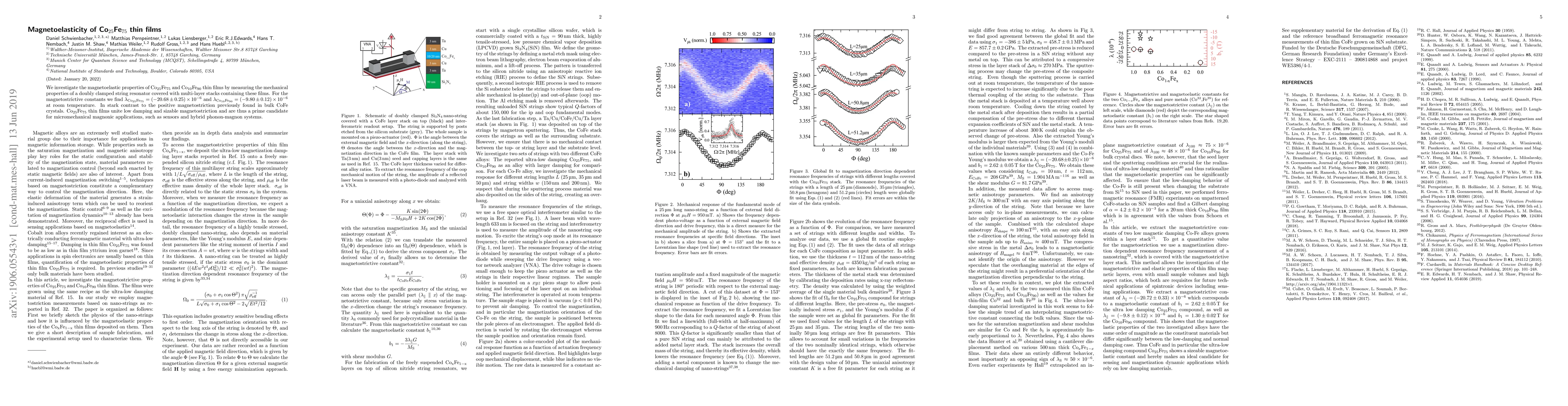 The research investigates magnetoelastic properties of Co25Fe75 and Co10Fe90 thin films using doubly clamped Si3N4 nano-string resonators covered with multi-layer stacks containing these films. Mechanical properties are measured to derive magnetostrictive constants and magnetoelastic constants.