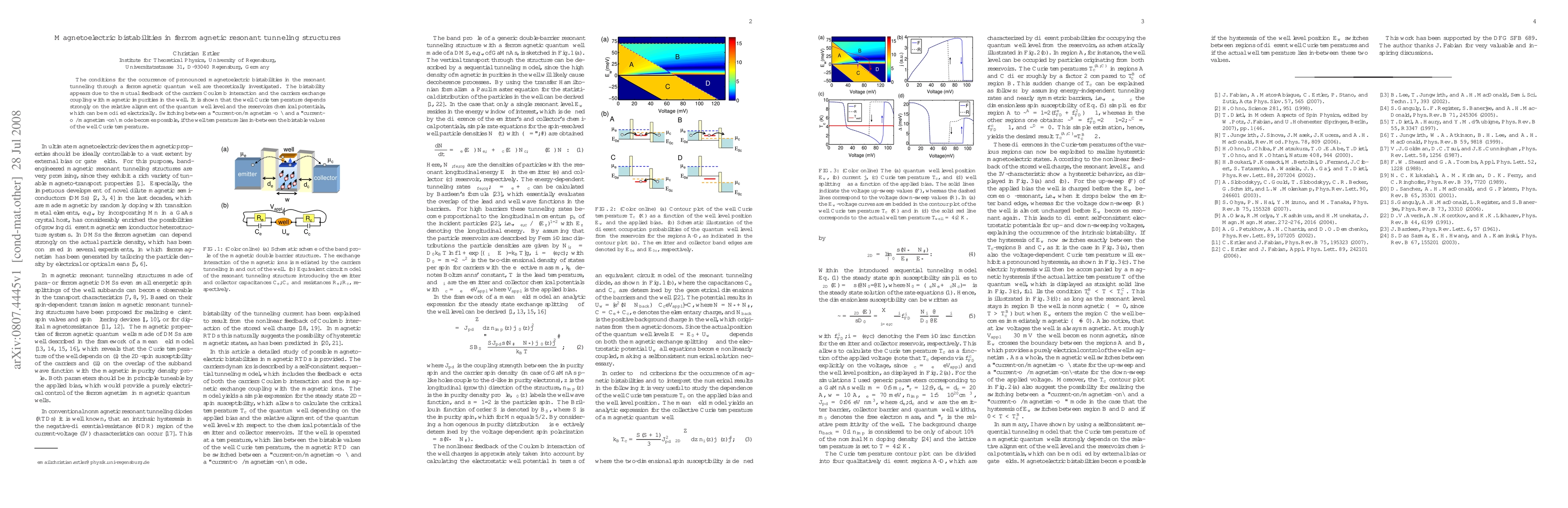 This paper investigates the conditions for magnetoelectric bistabilities in ferromagnetic resonant tunneling structures, revealing the interplay between Coulomb interaction and exchange coupling. It demonstrates that switching between current-on/magnetism-off and current-off/magnetism-on states is feasible depending on the alignment of quantum well levels and chemical potentials, which can be electrically controlled.
