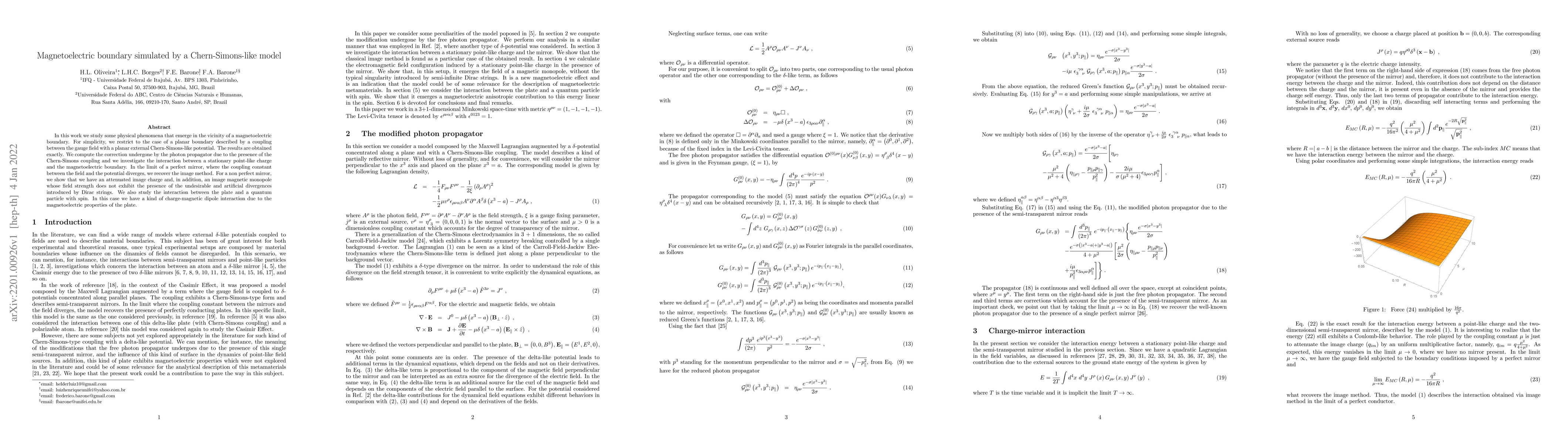 In this work we study some physical phenomena that emerge in the vicinity of a magnetoelectric boundary. For simplicity, we restrict to the case of a planar boundary described by a coupling between the gauge field with a planar external Chern-Simons-like potential. The results are obtained exactly. We compute the correction undergone by the photon propagator due to the presence of the Chern-Simons coupling and we investigate the interaction between a stationary point-like charge and the magnetoelectric boundary. In the limit of a perfect mirror, where the coupling constant between the field and the potential diverges, we recover the image method. For a non perfect mirror, we show that we have an attenuated image charge and, in addition, an image magnetic monopole whose field strength does not exhibit the presence of the undesirable and artificial divergences introduced by Dirac strings. We also study the interaction between the plate and a quantum particle with spin. In this case we have a kind of charge-magnetic dipole interaction due to the magnetoelectric properties of the plate.