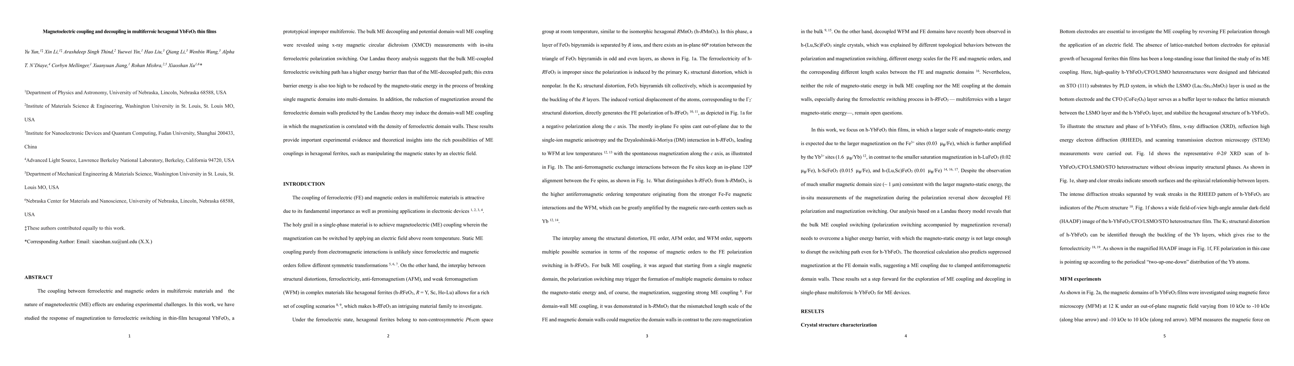 The coupling between ferroelectric and magnetic orders in multiferroic materials and the nature of magnetoelectric (ME) effects are enduring experimental challenges. In this work, we have studied the response of magnetization to ferroelectric switching in thin-film hexagonal YbFeO3, a prototypical improper multiferroic. The bulk ME decoupling and potential domain-wall ME coupling were revealed using x-ray magnetic circular dichroism (XMCD) measurements with in-situ ferroelectric polarization switching. Our Landau theory analysis suggests that the bulk ME-coupled ferroelectric switching path has a higher energy barrier than that of the ME-decoupled path; this extra barrier energy is also too high to be reduced by the magneto-static energy in the process of breaking single magnetic domains into multi-domains. In addition, the reduction of magnetization around the ferroelectric domain walls predicted by the Landau theory may induce the domain-wall ME coupling in which the magnetization is correlated with the density of ferroelectric domain walls. These results provide important experimental evidence and theoretical insights into the rich possibilities of ME couplings in hexagonal ferrites, such as manipulating the magnetic states by an electric field.