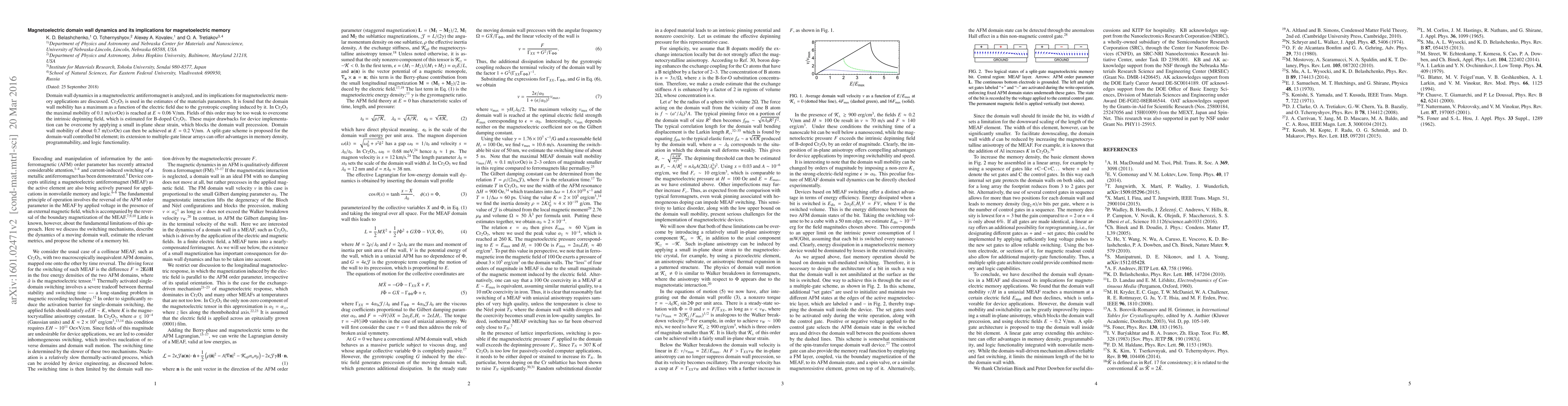 Domain wall dynamics in a magnetoelectric antiferromagnet is analyzed, and its implications for magnetoelectric memory applications are discussed. Cr$_2$O$_3$ is used in the estimates of the materials parameters. It is found that the domain wall mobility has a maximum as a function of the electric field due to the gyrotropic coupling induced by it. In Cr$_2$O$_3$ the maximal mobility of 0.1 m/(s$\times$Oe) is reached at $E\approx0.06$ V/nm. Fields of this order may be too weak to overcome the intrinsic depinning field, which is estimated for B-doped Cr$_2$O$_3$. These major drawbacks for device implementation can be overcome by applying a small in-plane shear strain, which blocks the domain wall precession. Domain wall mobility of about 0.7 m/(s$\times$Oe) can then be achieved at $E=0.2$ V/nm. A split-gate scheme is proposed for the domain-wall controlled bit element; its extension to multiple-gate linear arrays can offer advantages in memory density, programmability, and logic functionality.
