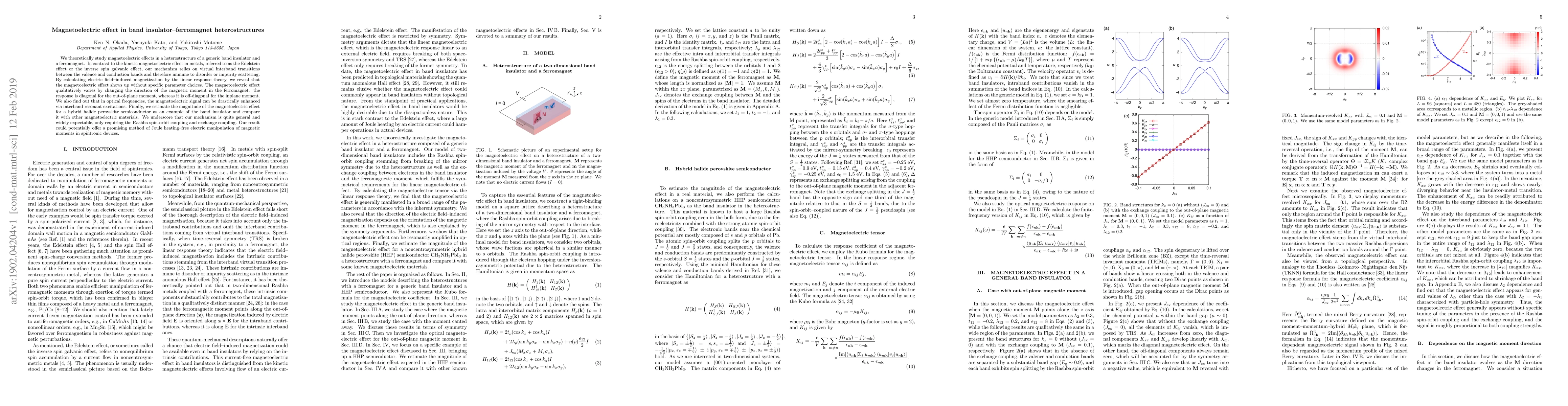 This paper theoretically explores magnetoelectric effects in heterostructures combining band insulators and ferromagnets, revealing a mechanism based on virtual interband transitions that is robust against disorder. The study shows that the effect can be significantly enhanced at optical frequencies and is general, requiring only Rashba spin-orbit coupling and exchange coupling, potentially enabling Joule heating-free electric control of magnetic moments in spintronic devices.