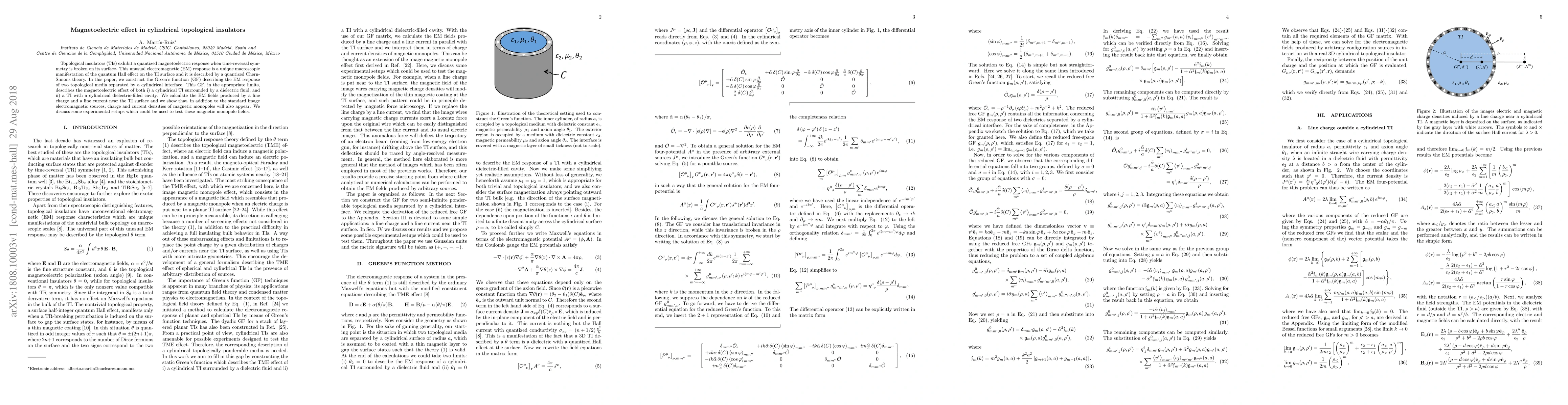This research constructs a Green's function to describe the electromagnetic response of cylindrical topological insulators, revealing a magnetoelectric effect involving magnetic monopole fields. It explores both TIs surrounded by dielectric fluids and TIs with dielectric-filled cavities, and suggests experimental setups for detecting these unique magnetic monopole effects.