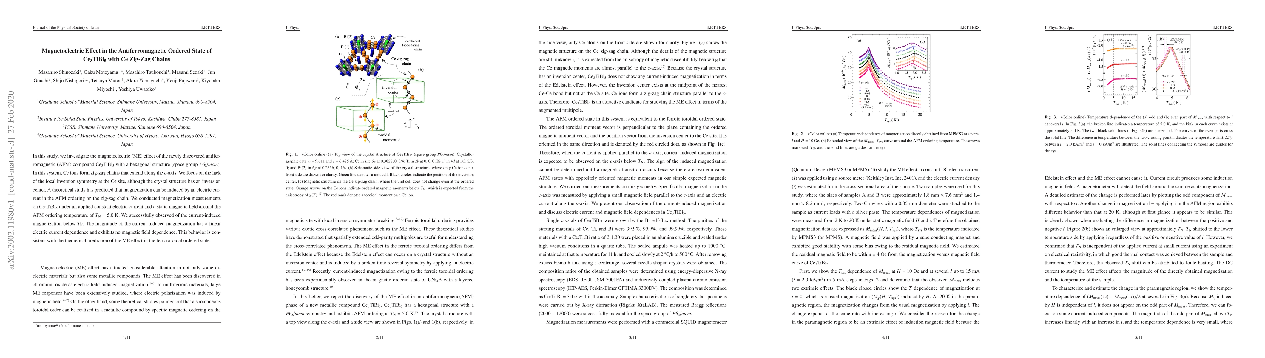 This study investigates the magnetoelectric effect in the antiferromagnetic compound Ce$_{3}$TiBi$_{5}$, where Ce ions form zig-zag chains. The research observed current-induced magnetization below the AFM ordering temperature, aligning with theoretical predictions of the ME effect in the ferrotoroidal state.