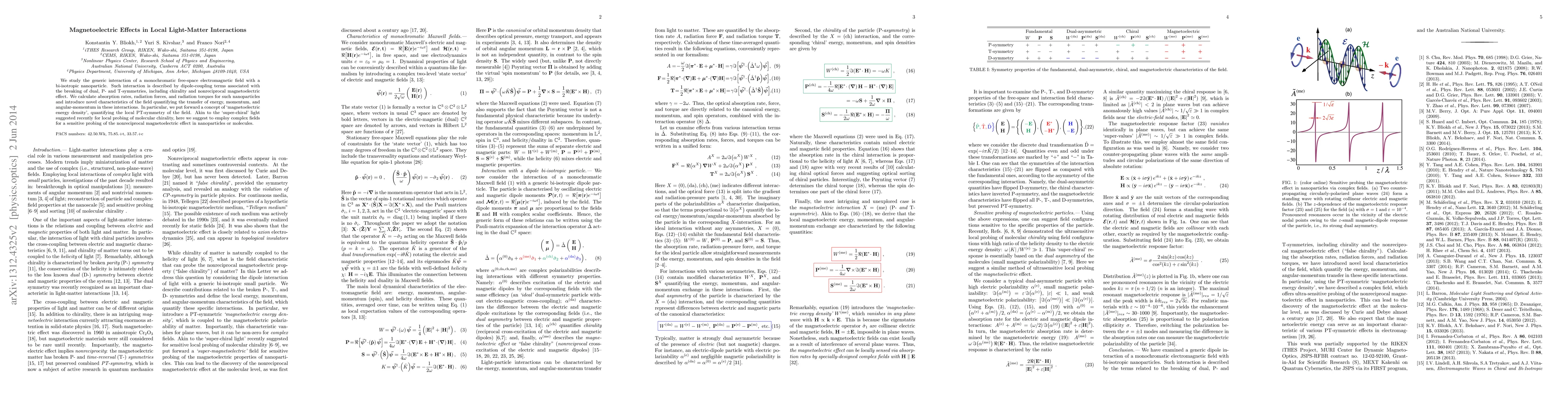 We study the generic interaction of a monochromatic electromagnetic field with bi-isotropic nanoparticles. Such an interaction is described by dipole-coupling terms associated with the breaking of dual, P- and T-symmetries, including the chirality and the nonreciprocal magnetoelectric effect. We calculate absorption rates, radiation forces, and radiation torques for the nanoparticles and introduce novel characteristics of the field quantifying the transfer of energy, momentum, and angular-momentum in these interactions. In particular, we put forward the concept of 'magnetoelectric energy density', quantifying the local PT-symmetry of the field. Akin to the 'super-chiral' light suggested recently for sensitive local probing of molecular chirality [Phys. Rev. Lett. 104, 163901 (2010); Science 332, 333 (2011)], here we describe a complex field for sensitive probing of the nonreciprocal magnetoelectric effect in nanoparticles or molecules.