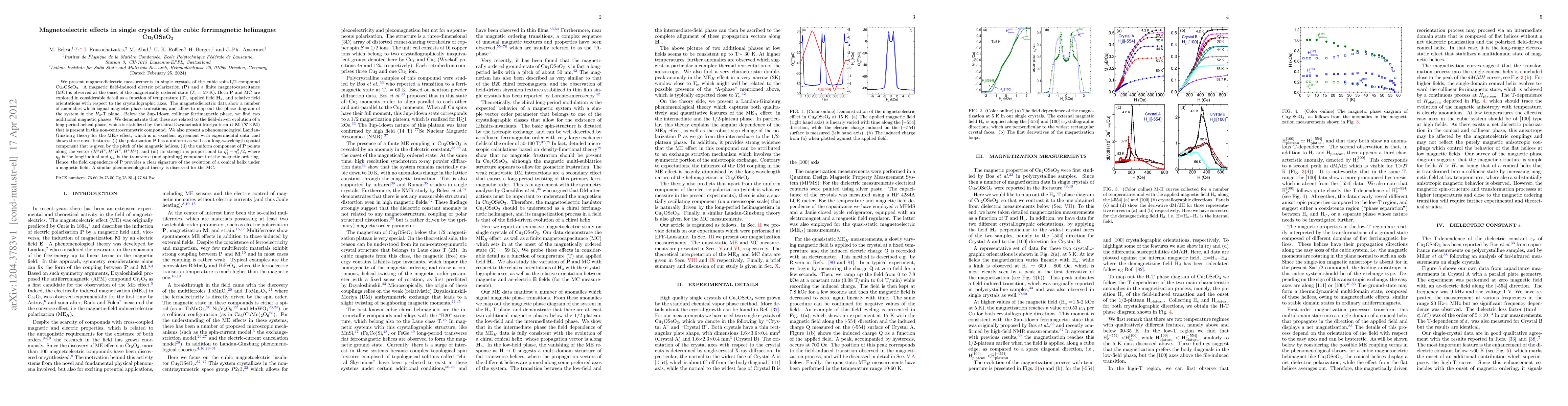 We present magnetodielectric measurements in single crystals of the cubic spin-1/2 compound Cu$_2$OSeO$_3$. A magnetic field-induced electric polarization ($\vec{P}$) and a finite magnetocapacitance (MC) is observed at the onset of the magnetically ordered state ($T_c = 59$ K). Both $\vec{P}$ and MC are explored in considerable detail as a function of temperature (T), applied field $\vec{H}_a$, and relative field orientations with respect to the crystallographic axes. The magnetodielectric data show a number of anomalies which signal magnetic phase transitions, and allow to map out the phase diagram of the system in the $H_a$-T plane. Below the 3up-1down collinear ferrimagnetic phase, we find two additional magnetic phases. We demonstrate that these are related to the field-driven evolution of a long-period helical phase, which is stabilized by the chiral Dzyalozinskii-Moriya term $D \vec{M} \cdot(\bs{\nabla}\times\vec{M})$ that is present in this non-centrosymmetric compound. We also present a phenomenological Landau-Ginzburg theory for the ME$_H$ effect, which is in excellent agreement with experimental data, and shows three novel features: (i) the polarization $\vec{P}$ has a uniform as well as a long-wavelength spatial component that is given by the pitch of the magnetic helices, (ii) the uniform component of $\vec{P}$ points along the vector $(H^yH^z, H^zH^x, H^xH^y)$, and (iii) its strength is proportional to $\eta_\parallel^2-\eta_\perp^2/2$, where $\eta_\parallel$ is the longitudinal and $\eta_\perp$ is the transverse (and spiraling) component of the magnetic ordering. Hence, the field dependence of P provides a clear signature of the evolution of a conical helix under a magnetic field. A similar phenomenological theory is discussed for the MC.