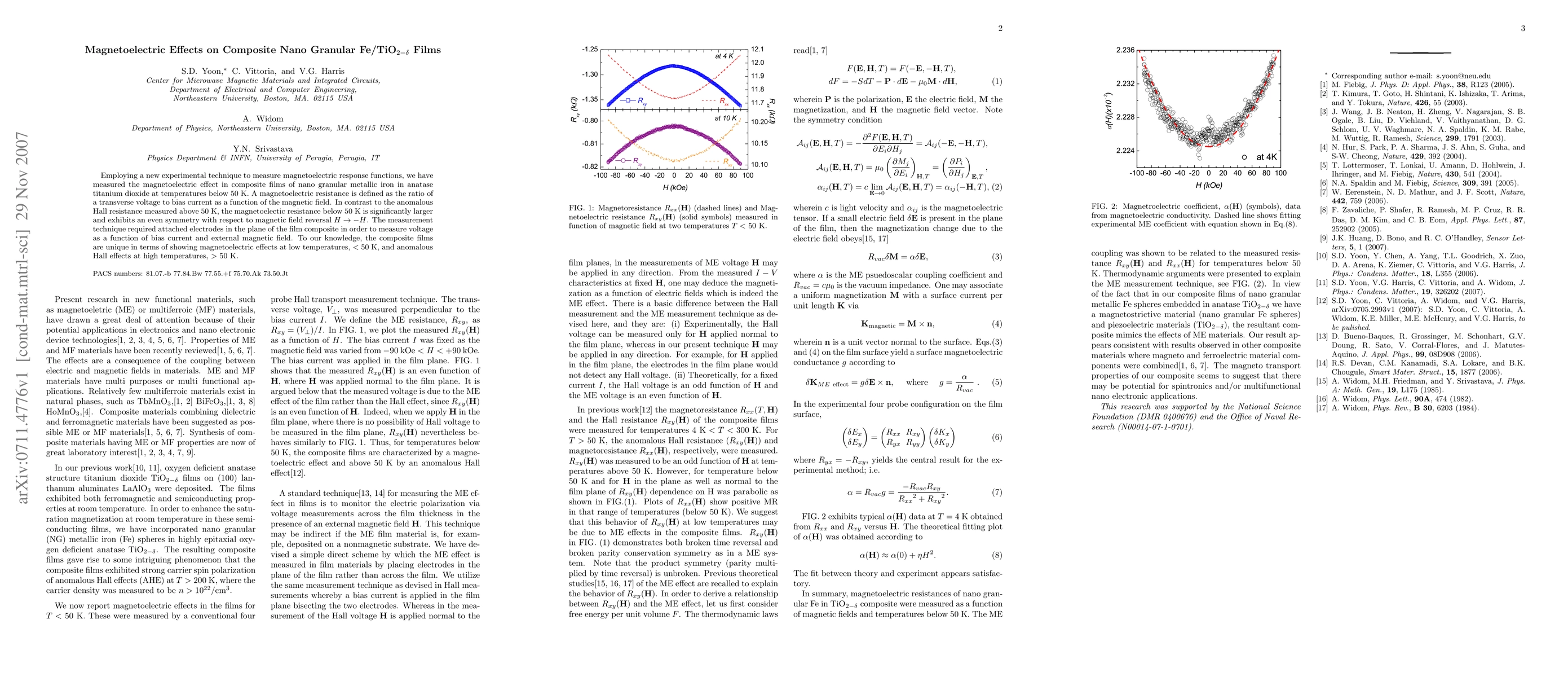 This paper reports on the magnetoelectric effects in composite nano granular $Fe/TiO_{2-\delta}$ films, measured using a novel technique below 50 K, revealing significantly larger magnetoelectric resistance compared to anomalous Hall effects above 50 K. The study highlights unique magnetoelectric behavior at low temperatures.