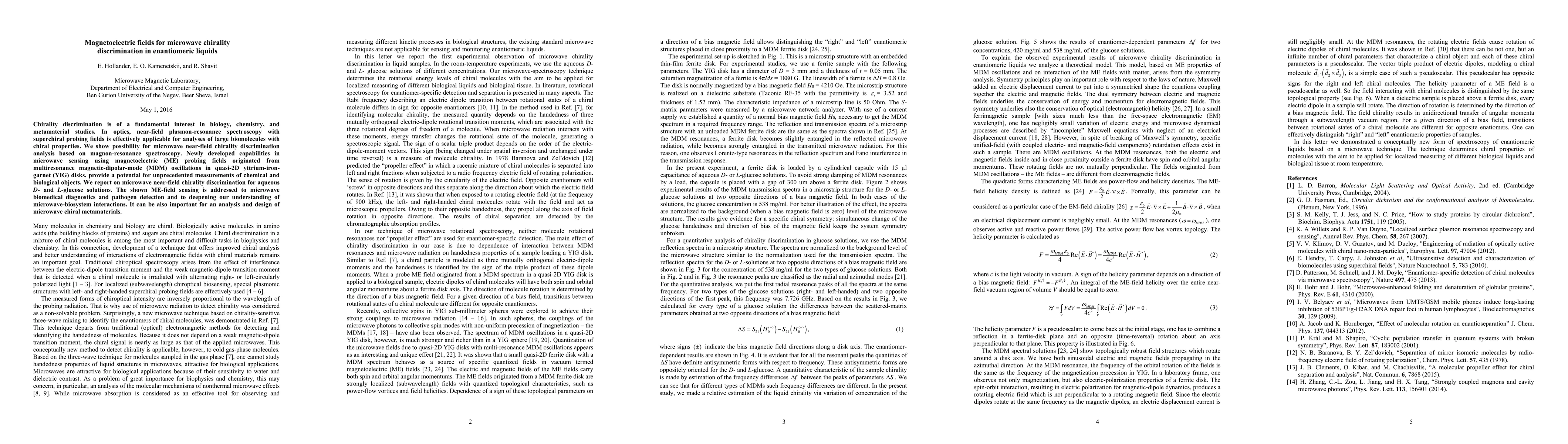 This paper explores microwave near-field chirality discrimination using magnetoelectric fields and magnon-resonance spectroscopy in quasi-2D yttrium-iron-garnet disks. The technique demonstrates potential for biomedical diagnostics and pathogen detection, as well as for studying microwave-biosystem interactions and designing chiral metamaterials.