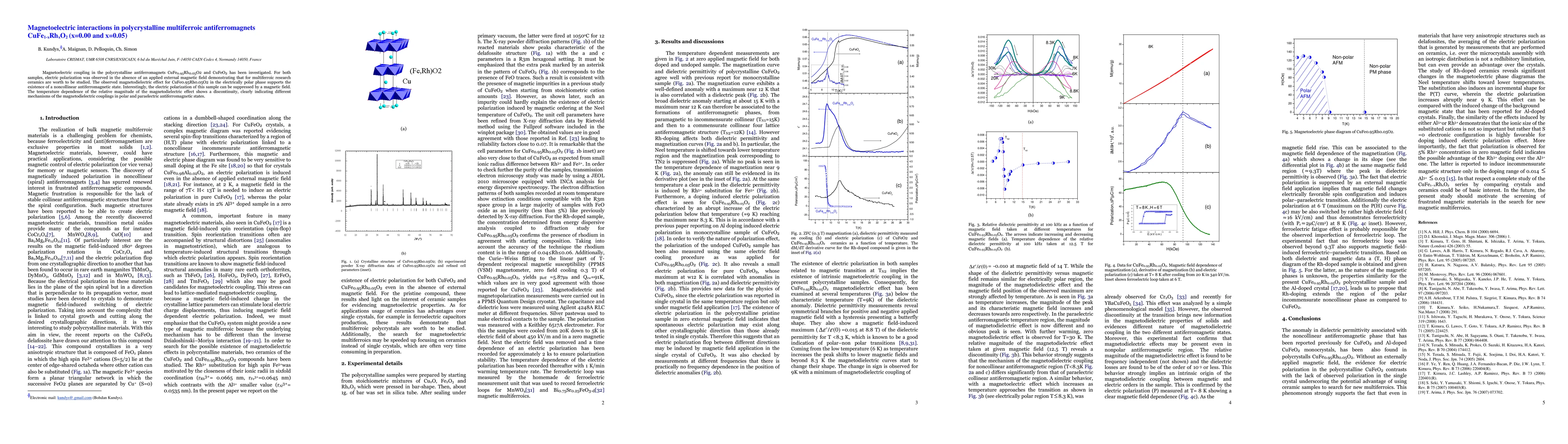 Magnetoelectric coupling in the polycrystalline antiferromagnets CuFe0.95Rh0.05O2 and CuFeO2 has been investigated. For both samples, electric polarization was observed in the absence of an applied external magnetic field demonstrating that for multiferroic research ceramics are worth to be studied. The observed magnetodielectric effect for CuFe0.95Rh0.05O2 in the electrically polar phase supports the existence of a noncollinear antiferromagnetic state. Interestingly, the electric polarization of this sample can be suppressed by a magnetic field. The temperature dependence of the relative magnitude of the magnetodielectric effect shows a discontinuity, clearly indicating different mechanisms of the magnetodielectric couplings in polar and paraelectric antiferromagnetic states.