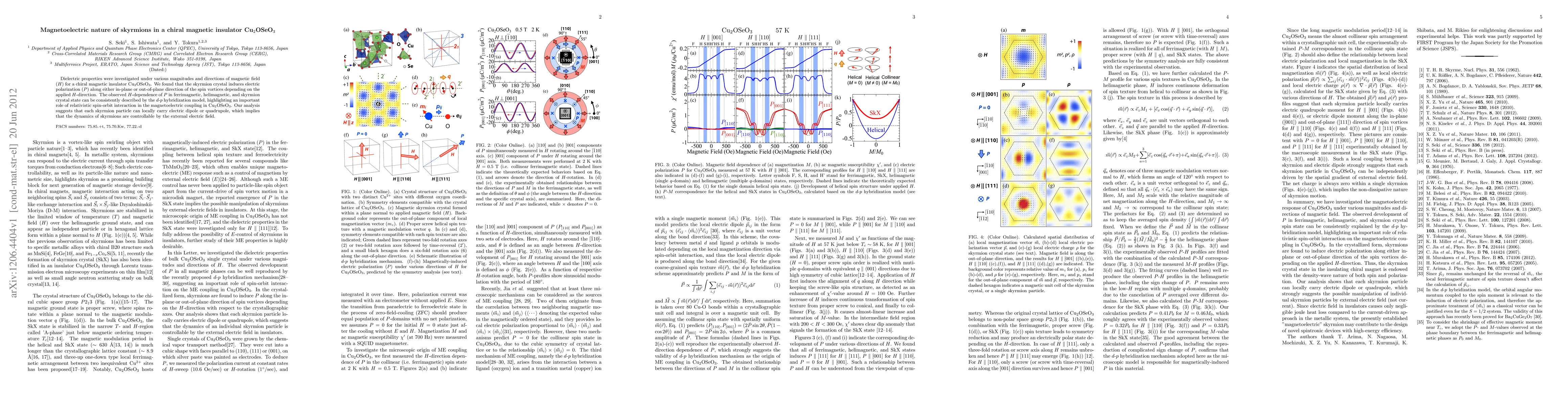 Researchers investigated dielectric properties of a chiral magnetic insulator Cu2OSe3 under varying magnetic fields, finding that skyrmion crystals induce electric polarization depending on the applied field direction. This suggests that each skyrmion particle can carry an electric dipole or quadrupole, making its dynamics controllable by external electric fields.