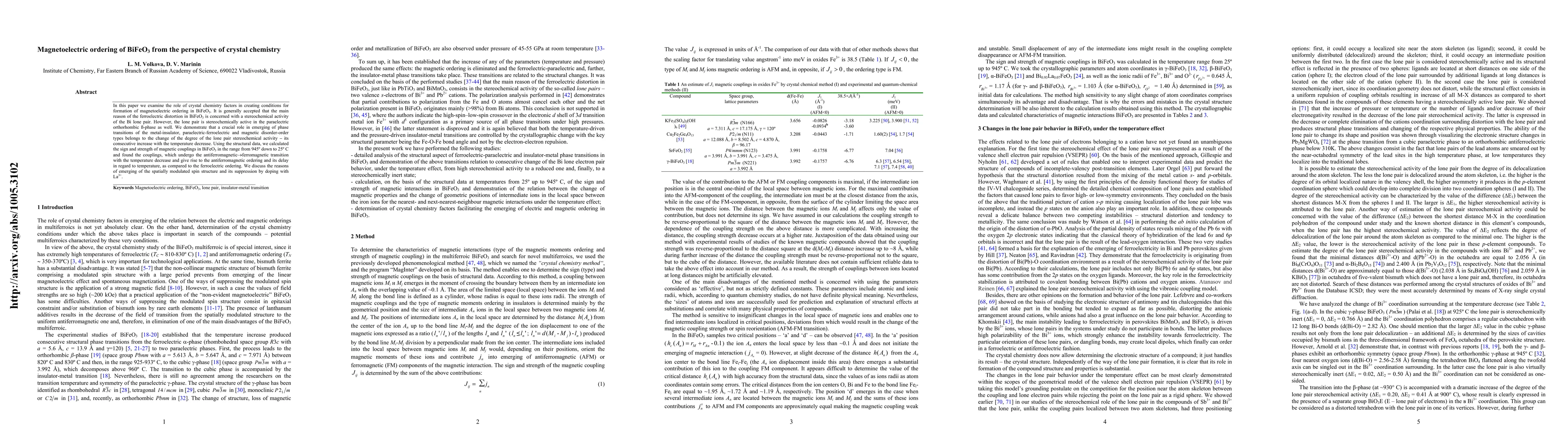 In this paper we examine the role of crystal chemistry factors in creating conditions for formation of magnetoelectric ordering in BiFeO3. It is generally accepted that the main reason of the ferroelectric distortion in BiFeO3 is concerned with a stereochemical activity of the Bi lone pair. However, the lone pair is stereochemically active in the paraelectric orthorhombic beta-phase as well. We demonstrate that a crucial role in emerging of phase transitions of the metal-insulator, paraelectric-ferroelectric and magnetic disorder-order types belongs to the change of the degree of the lone pair stereochemical activity - its consecutive increase with the temperature decrease. Using the structural data, we calculated the sign and strength of magnetic couplings in BiFeO3 in the range from 945 C down to 25 C and found the couplings, which undergo the antiferromagnetic-ferromagnetic transition with the temperature decrease and give rise to the antiferromagnetic ordering and its delay in regard to temperature, as compared to the ferroelectric ordering. We discuss the reasons of emerging of the spatially modulated spin structure and its suppression by doping with La3+.