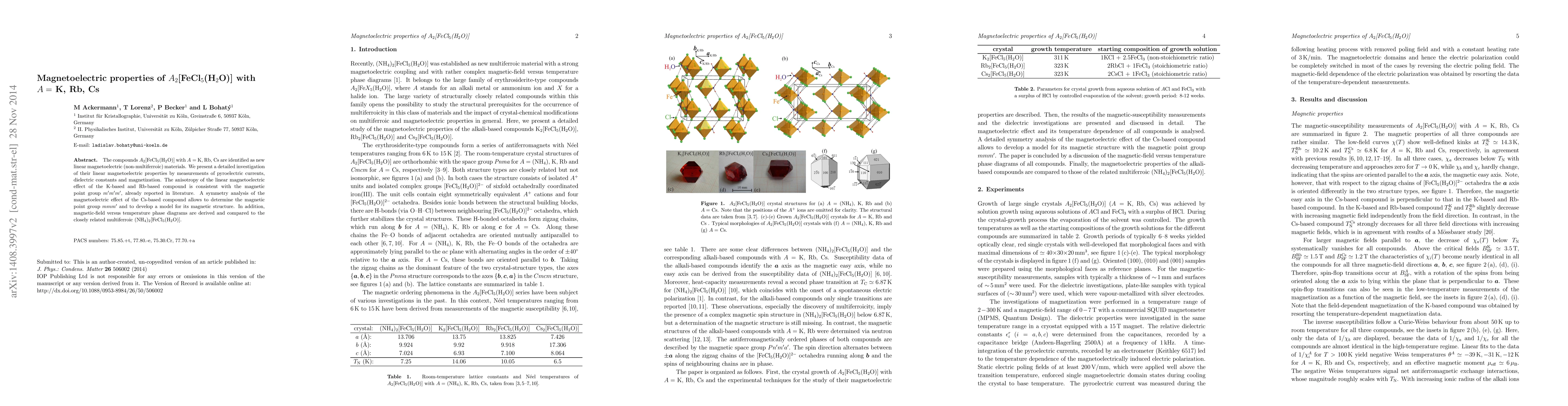 This paper investigates the magnetoelectric properties of $A_2$[FeCl$_5$(H$_2$O)] compounds (where $A$ is K, Rb, or Cs), identifying them as new linear magnetoelectric materials. The study reveals the anisotropy and magnetic point group of these compounds, with a detailed model for the Cs-based compound's magnetic structure.