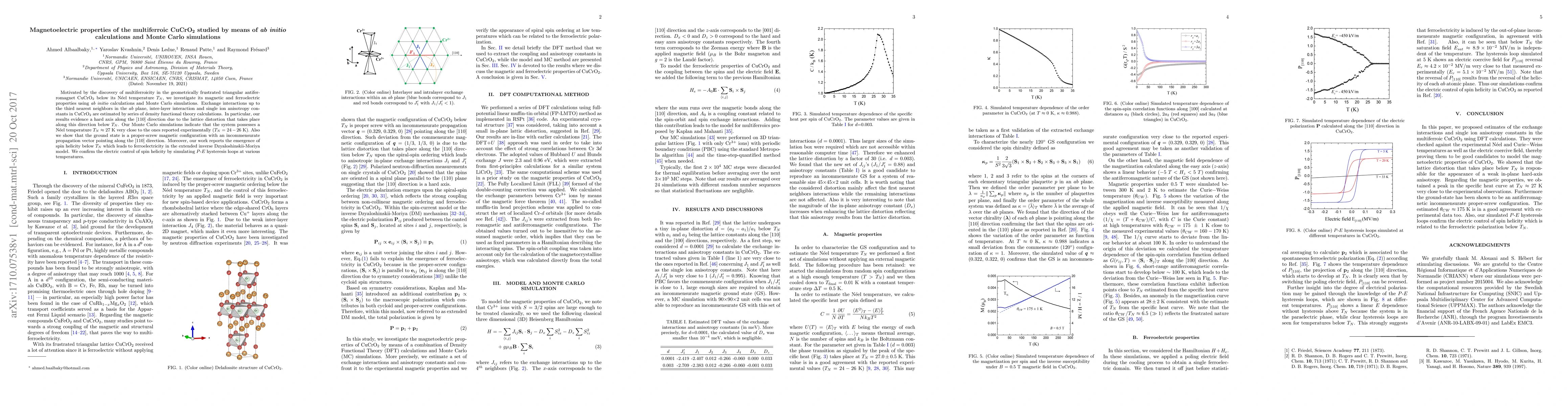 This paper investigates the magnetoelectric properties of CuCrO$_2$ using ab initio calculations and Monte Carlo simulations, revealing a proper-screw magnetic configuration and the emergence of spin helicity leading to ferroelectricity below its N\'eel temperature, confirmed by simulated $P$-$E$ hysteresis loops.
