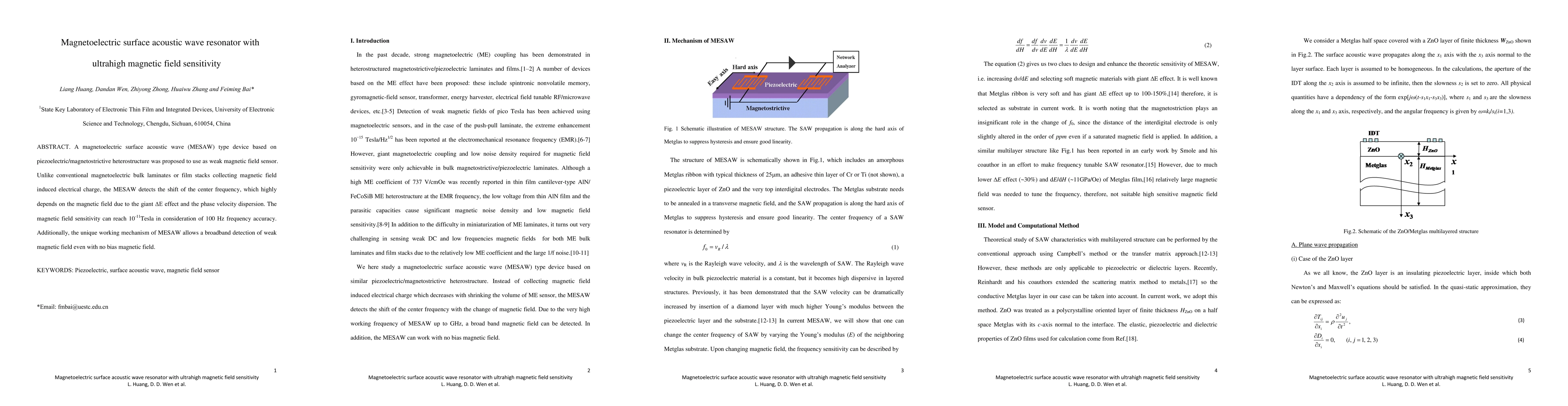 A magnetoelectric surface acoustic wave (MESAW) resonator based on piezoelectric/magnetostrictive heterostructures detects magnetic fields by frequency shift, achieving ultrahigh sensitivity of 10^(-11) Tesla without requiring a bias magnetic field. This novel mechanism enables broadband detection of weak magnetic fields.