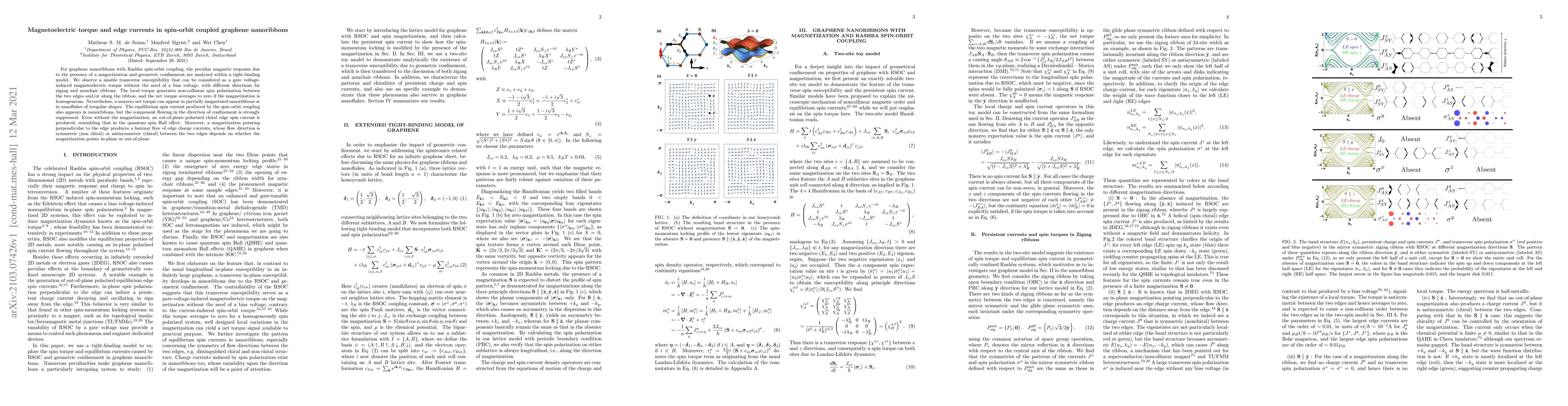 This paper analyzes the magnetic response in spin-orbit coupled graphene nanoribbons, revealing a gate voltage-induced magnetoelectric torque without bias voltage, and different torque directions in zigzag and armchair configurations. It also discusses edge spin currents and charge currents influenced by magnetization orientation, showing chiral and non-chiral behaviors.