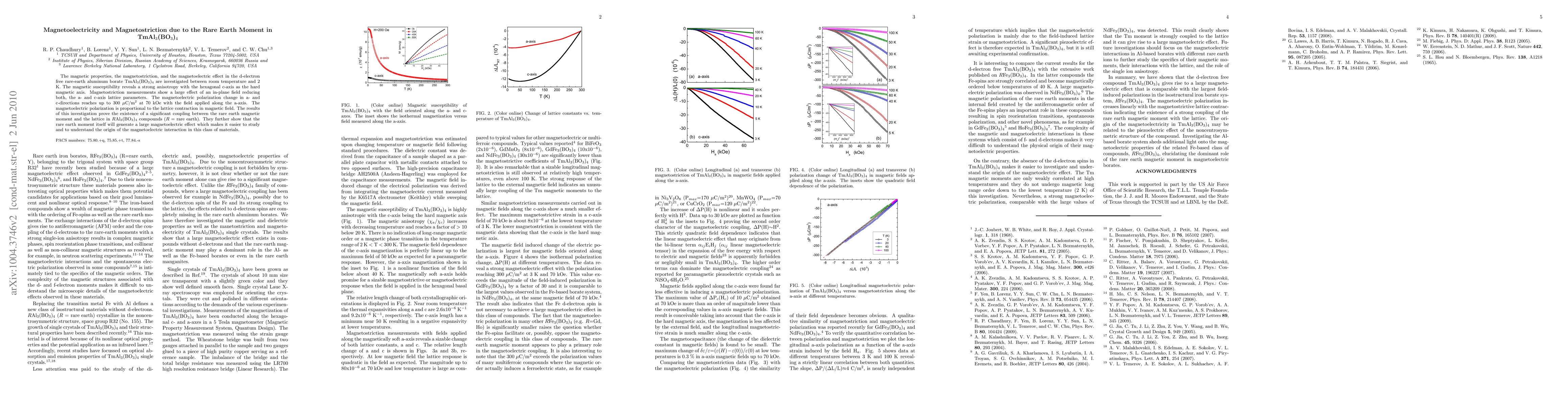 The magnetic properties, the magnetostriction, and the magnetoelectric effect in the d-electron free rare-earth aluminum borate TmAl$_3$(BO$_3$)$_4$ are investigated between room temperature and 2 K. The magnetic susceptibility reveals a strong anisotropy with the hexagonal c-axis as the hard magnetic axis. Magnetostriction measurements show a large effect of an in-plane field reducing both, the a- and c-axis lattice parameters. The magnetoelectric polarization change in a- and c-directions reaches up to 300 $\mu$C/m$^2$ at 70 kOe with the field applied along the a-axis. The magnetoelectric polarization is proportional to the lattice contraction in magnetic field. The results of this investigation prove the existence of a significant coupling between the rare earth magnetic moment and the lattice in $R$Al$_3$(BO$_3$)$_4$ compounds ($R$ = rare earth). They further show that the rare earth moment itself will generate a large magnetoelectric effect which makes it easier to study and to understand the origin of the magnetoelectric interaction in this class of materials.