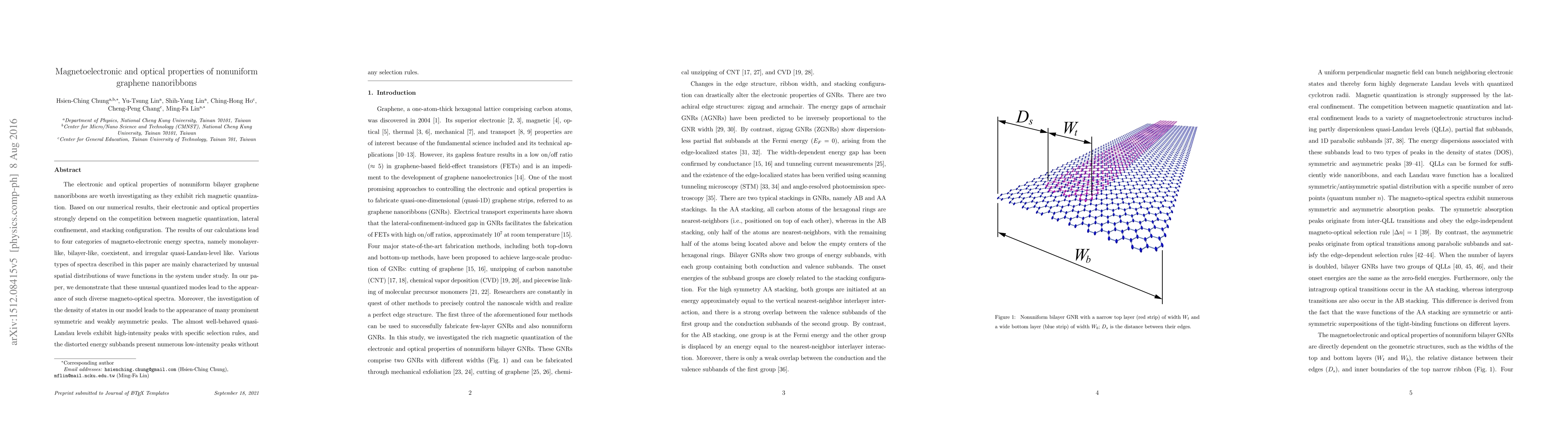 This paper investigates the magnetoelectronic and optical properties of nonuniform bilayer graphene nanoribbons, revealing that their electronic and optical behaviors are heavily influenced by magnetic quantization, lateral confinement, and stacking configuration. The study categorizes the resulting magneto-electronic energy spectra into four types, characterized by unique wave function distributions, leading to diverse magneto-optical spectra and prominent peaks in the density of states.