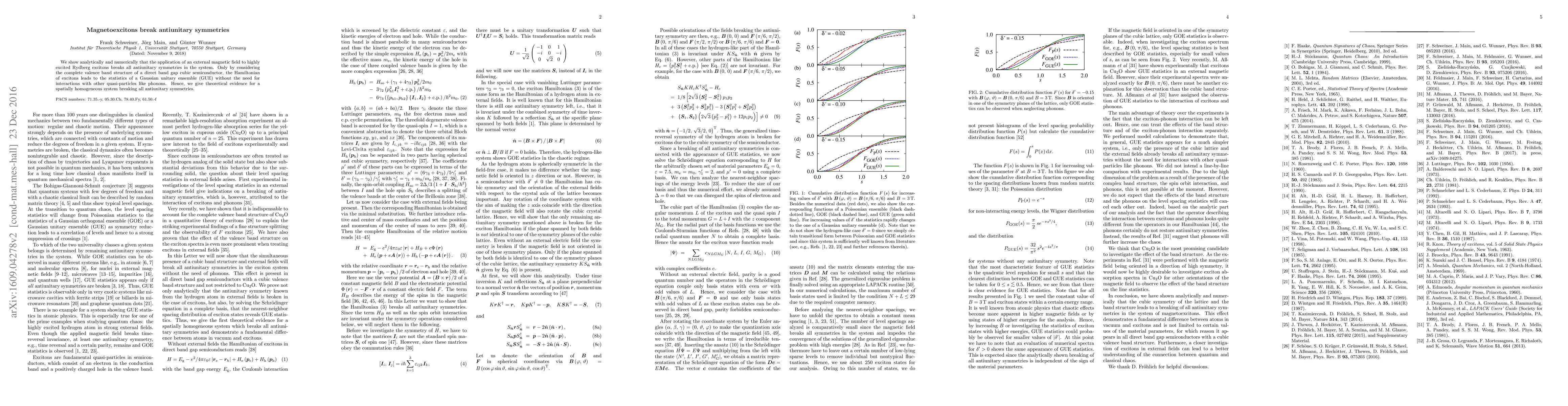 A magnetic field breaks antiunitary symmetries in highly excited Rydberg excitons, leading to a Gaussian unitary ensemble without the need for interactions with other particles.