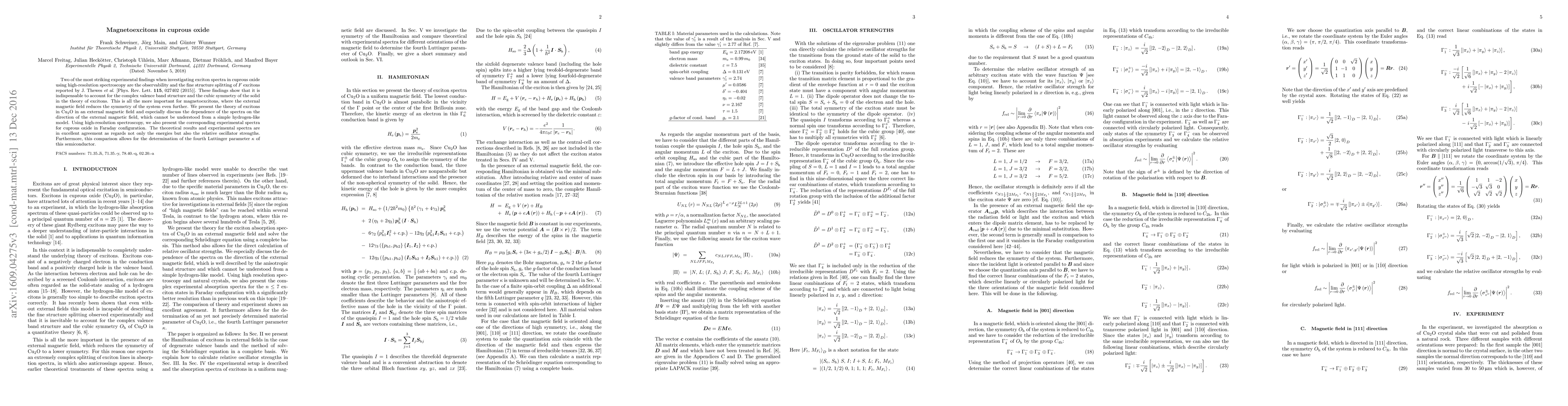 Two of the most striking experimental findings when investigating exciton spectra in cuprous oxide using high-resolution spectroscopy are the observability and the fine structure splitting of $F$ excitons reported by J. Thewes et al. [Phys. Rev. Lett. 115, 027402 (2015)]. These findings show that it is indispensable to account for the complex valence band structure and the cubic symmetry of the solid in the theory of excitons. This is all the more important for magnetoexcitons, where the external magnetic field reduces the symmetry of the system even further. We present the theory of excitons in $\mathrm{Cu_{2}O}$ in an external magnetic field and especially discuss the dependence of the spectra on the direction of the external magnetic field, which cannot be understood from a simple hydrogen-like model. Using high-resolution spectroscopy, we also present the corresponding experimental spectra for cuprous oxide in Faraday configuration. The theoretical results and experimental spectra are in excellent agreement as regards not only the energies but also the relative oscillator strengths. Furthermore, this comparison allows for the determination of the fourth Luttinger parameter $\kappa$ of this semiconductor.
