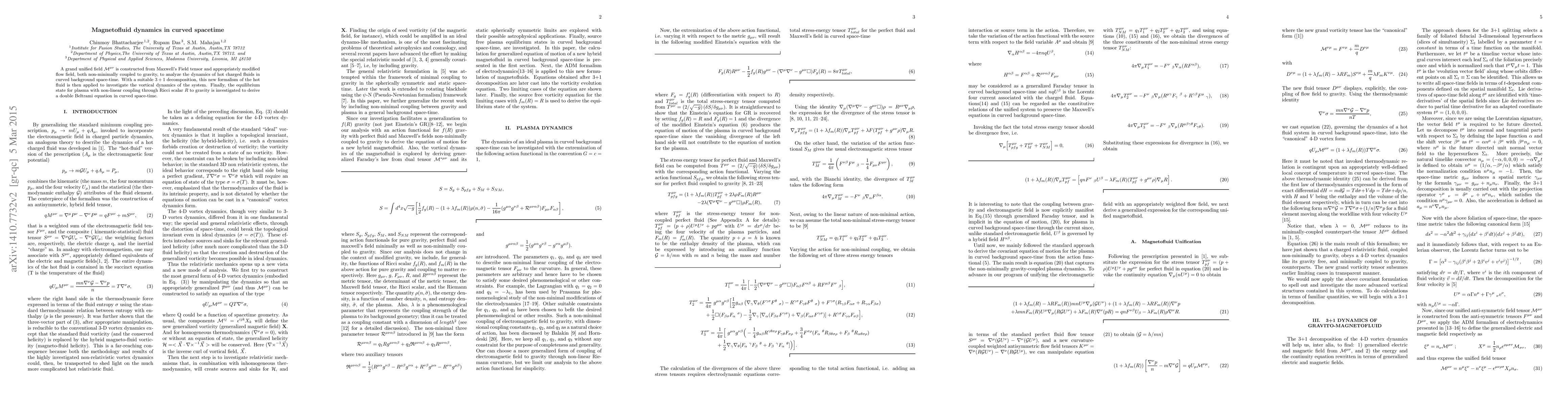 This paper constructs a grand unified field $\mathcal{M}^{\mu\nu}$ from Maxwell's tensor and a modified flow field, both coupled to gravity, to analyze the dynamics of hot charged fluids in curved spacetime. It derives a double Beltrami equation for the equilibrium state of plasma with non-linear Ricci scalar coupling.