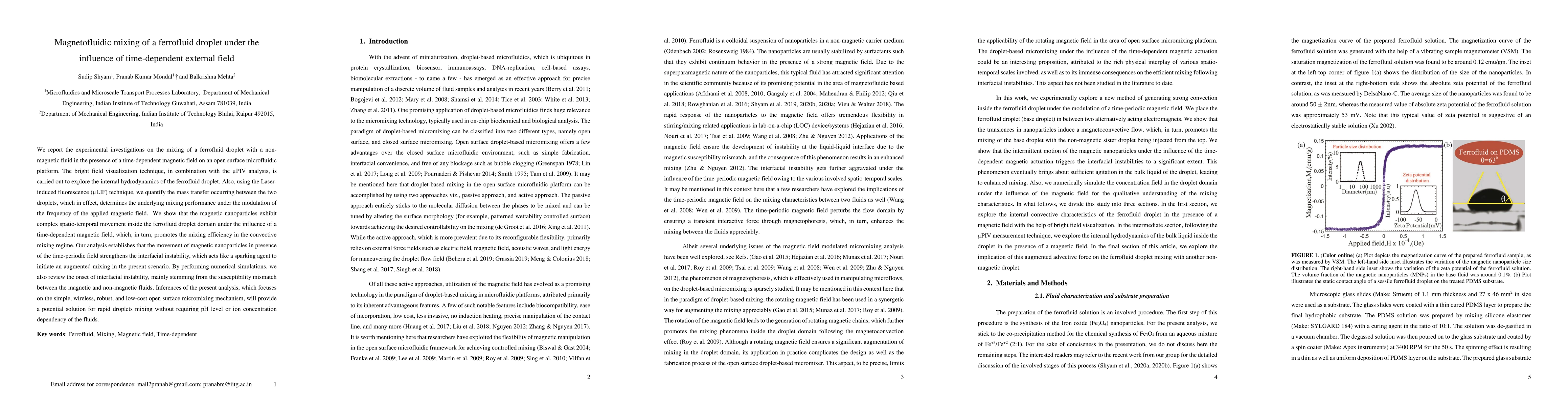 We report the experimental investigations on the mixing of a ferrofluid droplet with a non-magnetic fluid in the presence of a time-dependent magnetic field on an open surface microfluidic platform. The bright field visualization technique, in combination with the micro-PIV analysis, is carried out to explore the internal hydrodynamics of the ferrofluid droplet. Also, using the Laser-induced fluorescence (micro-LIF) technique, we quantify the mass transfer occurring between the two droplets, which in effect, determines the underlying mixing performance under the modulation of the frequency of the applied magnetic field. We show that the magnetic nanoparticles exhibit complex spatio-temporal movement inside the ferrofluid droplet domain under the influence of a time-dependent magnetic field, which, in turn, promotes the mixing efficiency in the convective mixing regime. Our analysis establishes that the movement of magnetic nanoparticles in presence of the time-periodic field strengthens the interfacial instability, which acts like a sparking agent to initiate an augmented mixing in the present scenario. By performing numerical simulations, we also review the onset of interfacial instability, mainly stemming from the susceptibility mismatch between the magnetic and non-magnetic fluids. Inferences of the present analysis, which focuses on the simple, wireless, robust, and low-cost open surface micromixing mechanism, will provide a potential solution for rapid droplets mixing without requiring pH level or ion concentration dependency of the fluids.